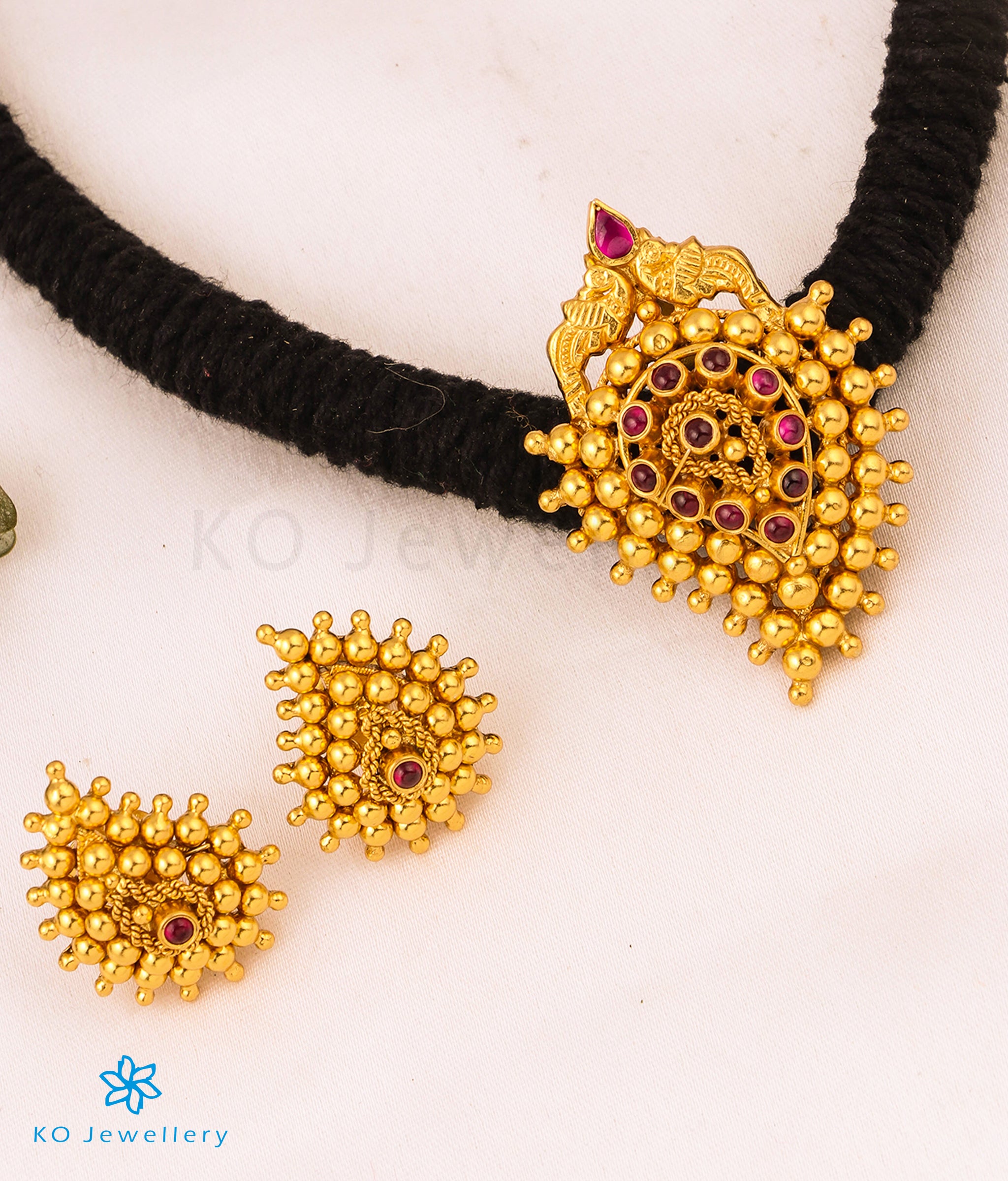 This stunning vintage necklace creates a mesmerising effect with its perfect symmetry and flawless craftsmanship. The paisley or mango-shape pendant at the center stands out with its attractive design highlighted with kempu stones, and twin-peacocks. The gorgeous gold-dipped pendant is crafted in sterling silver (92.5%) and woven into black cotton thread. It is paired with matching paisley shaped earstuds.