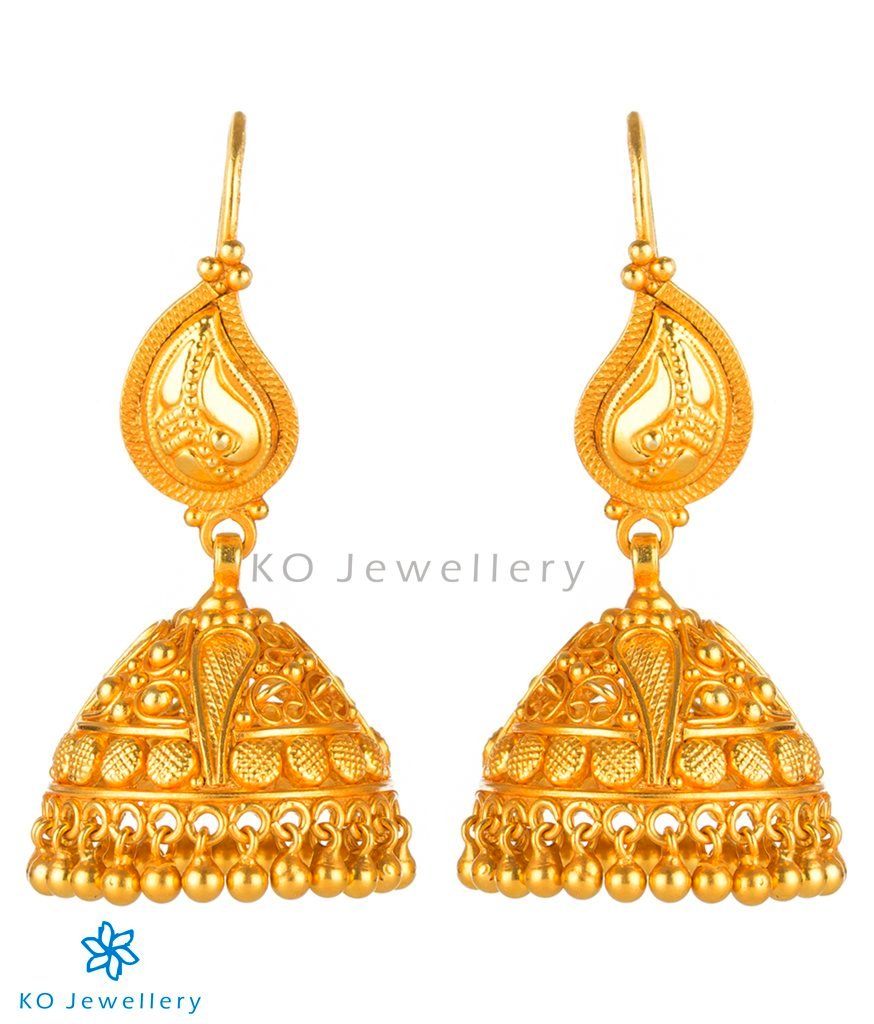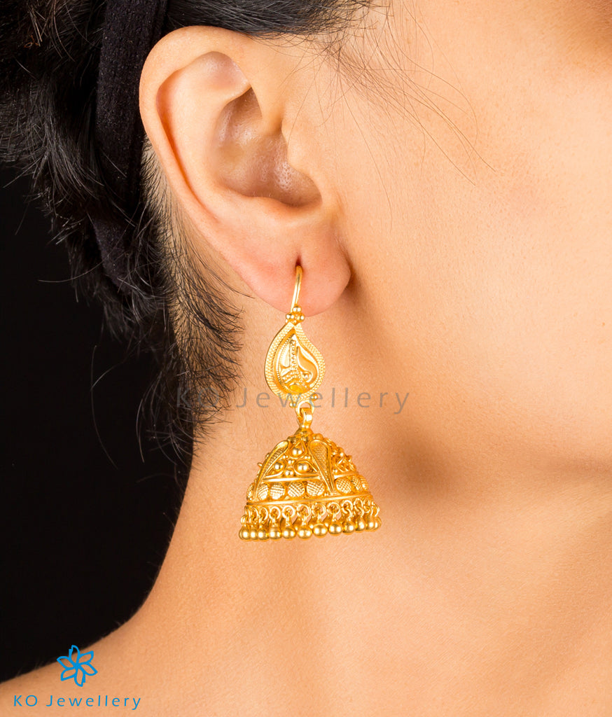 A stunning pair of handcrafted Pure 925 Sterling Silver Temple Jewellery paisley design jhumkas gold dipped in 24 K . Expertly crafted by skilled artisans, these jhumkas are a perfect blend of classic temple jewelry with intricate paisley motifs that reflect the rich cultural heritage of India.