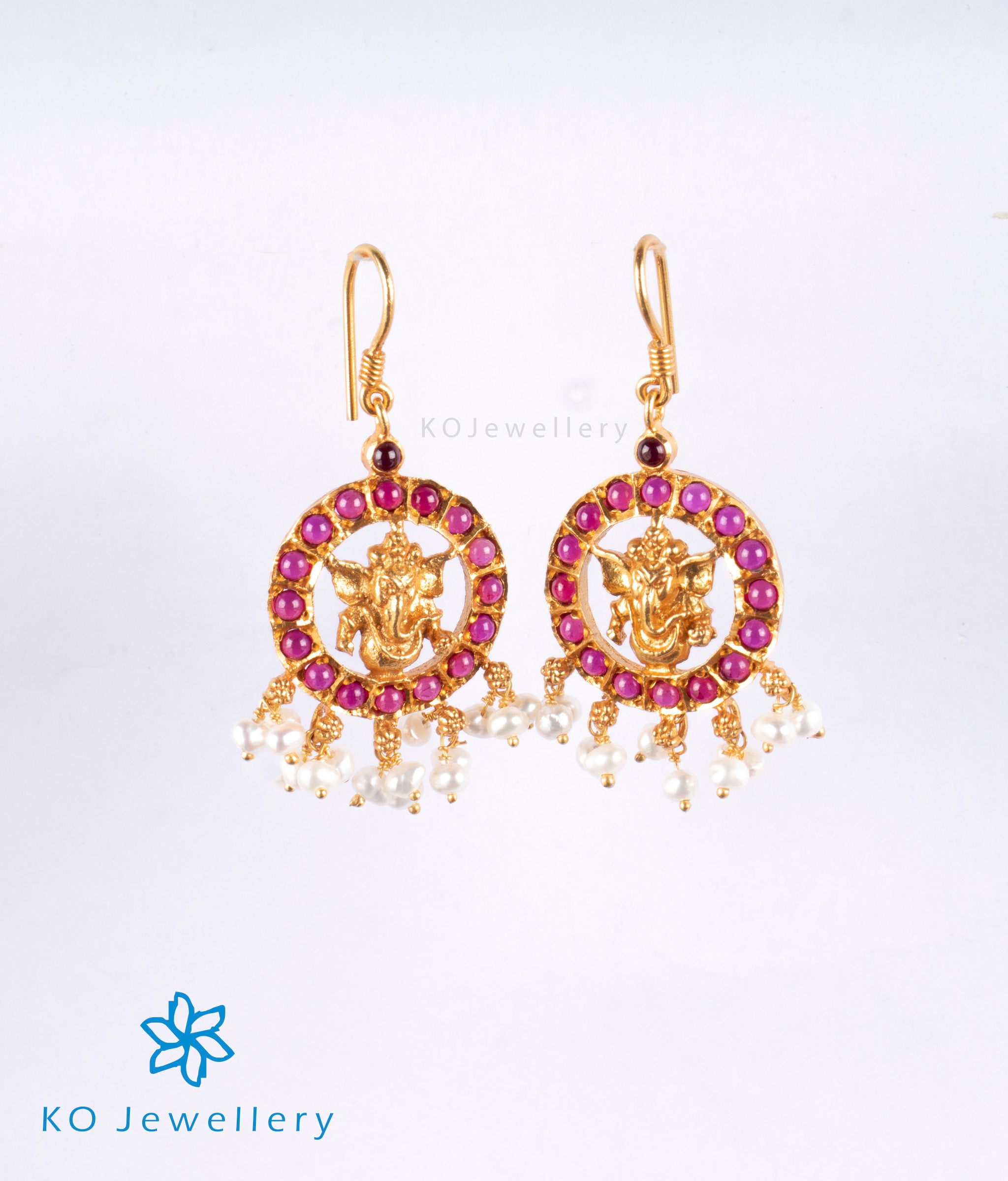 A pretty pair of dainty handcrafted earrings , in Sterling Silver (92.5%) studded with kempu stones with a Ganesha figure in the center. If you like designs that are unique, this piece is for you.