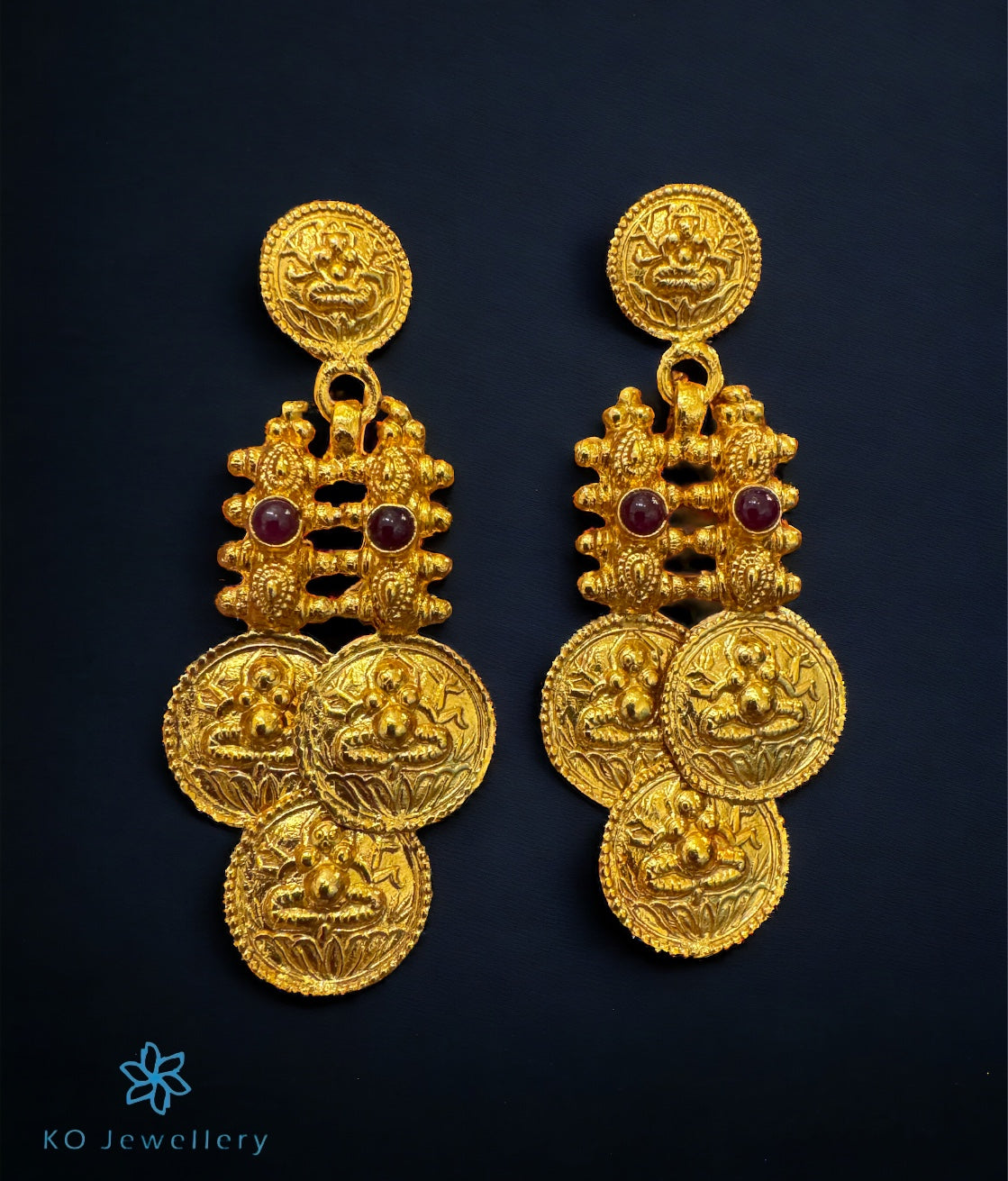 An iconic design, this traditional earring with the image of goddess Lakshmi is crafted using techniques used in South Indian antique jewellery in Sterling Silver (92.5) and has been gold-dipped to perfection. This piece is also available in the antique silver-finish.