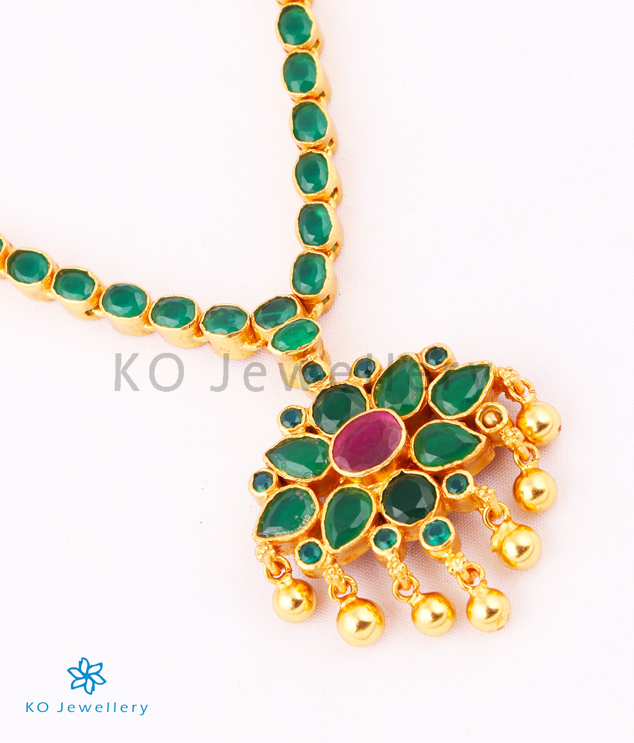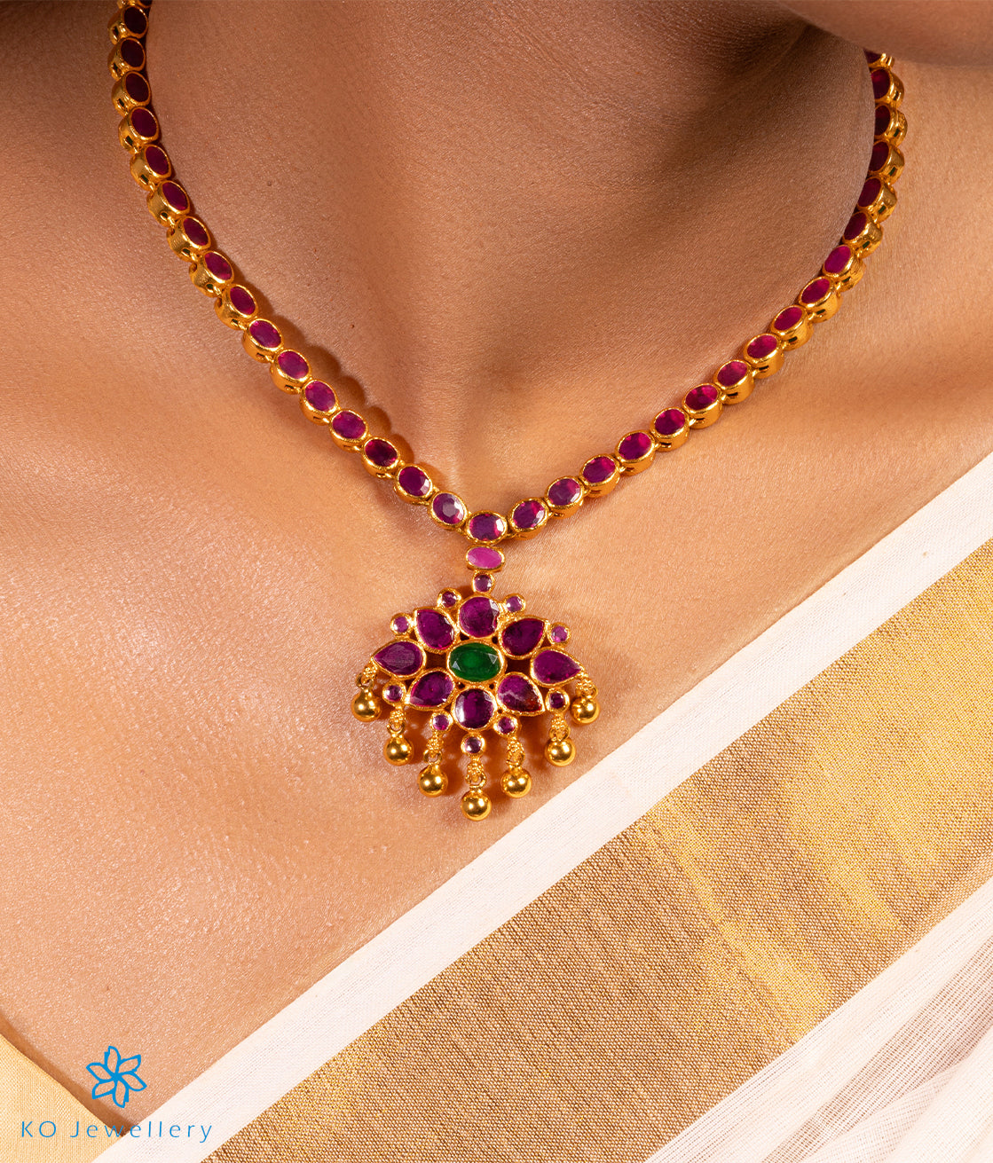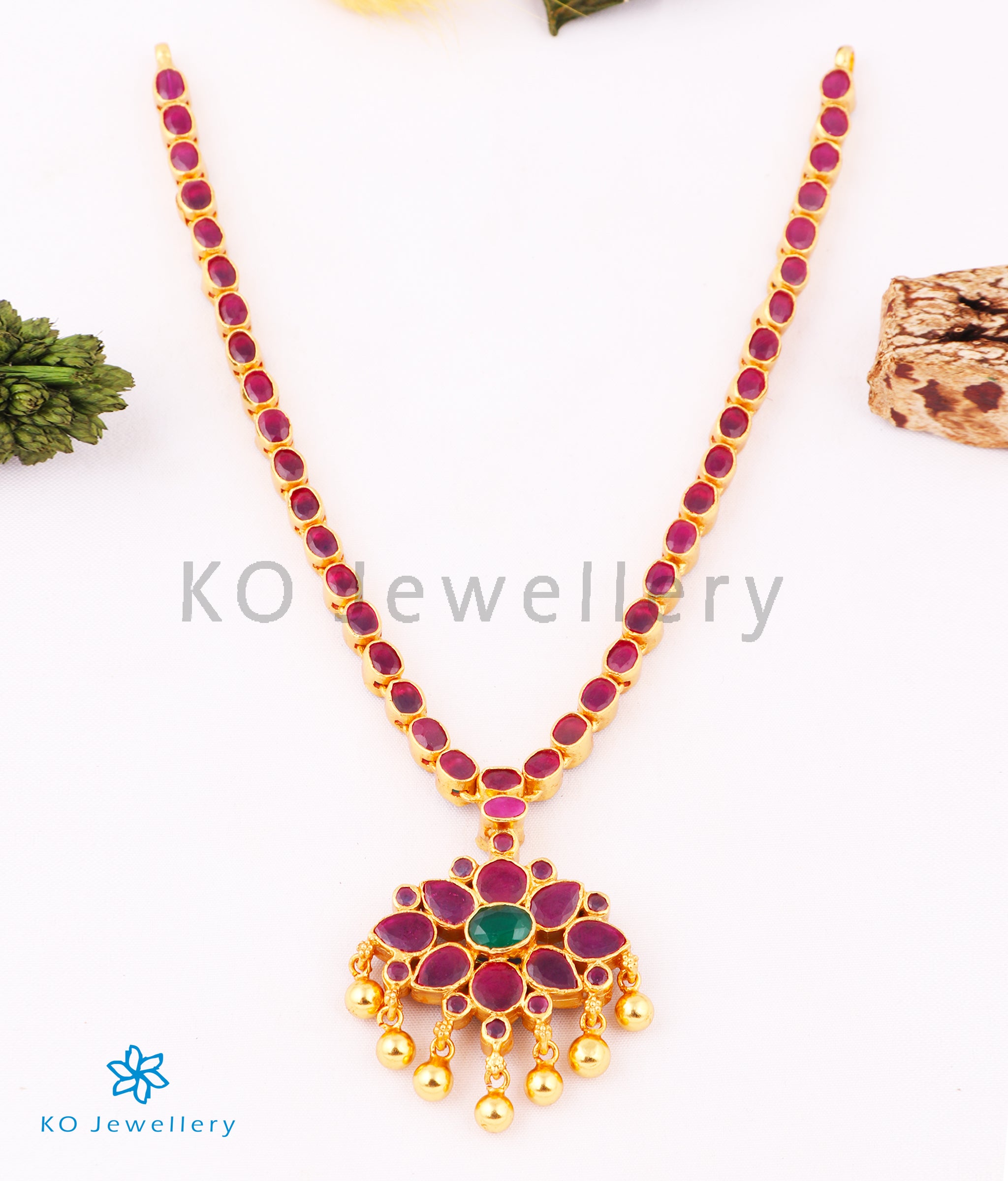 A classic design of south Indian temple jewellery this necklace has faceted red kempu stones set singly in a closed setting and is handcrafted in Sterling Silver (92.5%) using techniques used in ancient South Indian antique gold temple jewellery.