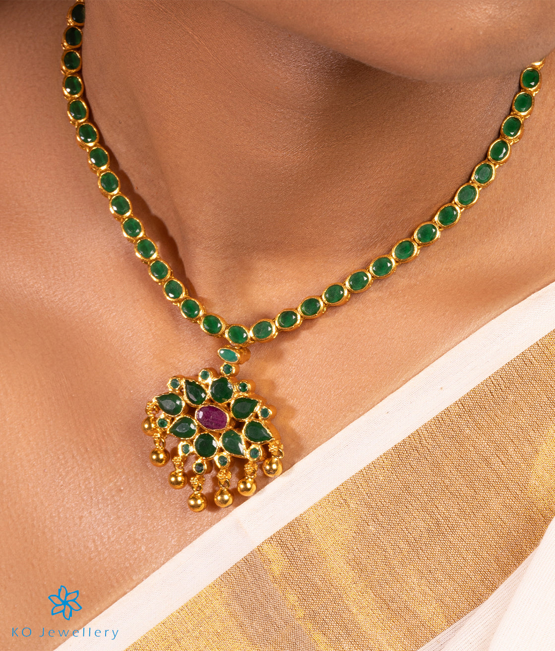 A gorgeous addige necklace with an attractive pendant, it is studded with red colured stones on one side while on the other side it has green stones. So you get to experience the convenience of wearing either red or green.