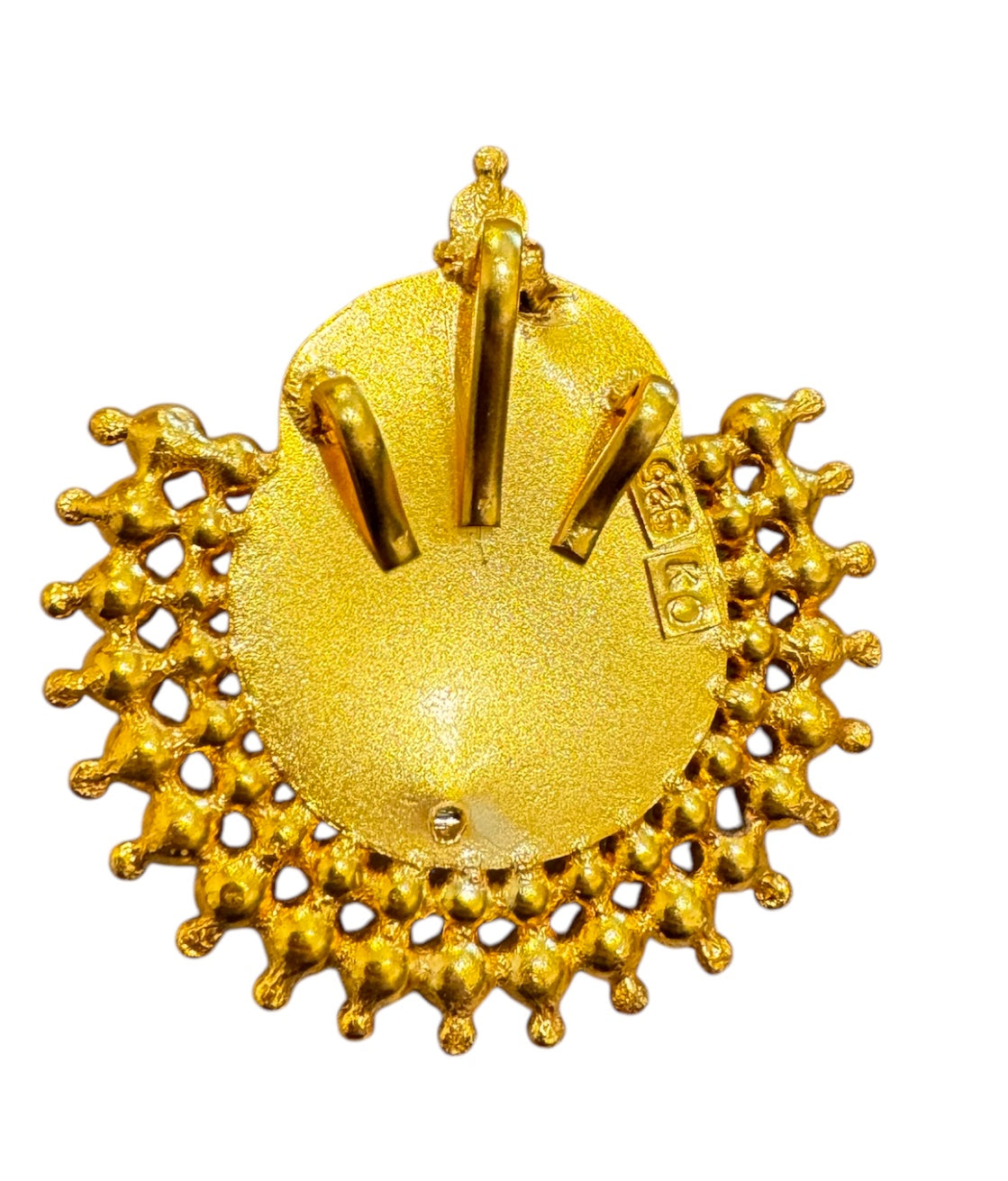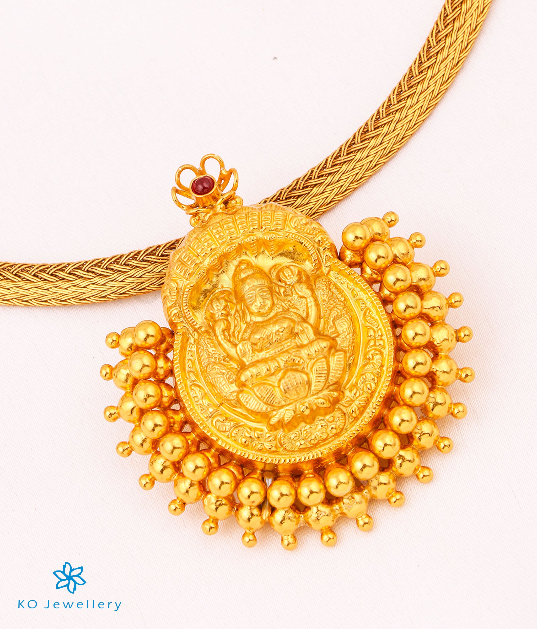 A traditional design Lakshmi pendant that is handcrafted using techniques used in ancient South Indian antique gold temple jewellery . The entire piece is crafted in pure Sterling Silver (92.5%) and dipped in 24 karat gold. This pendant has a pair of matching earstuds with a screw back (or bombay screw) closure .