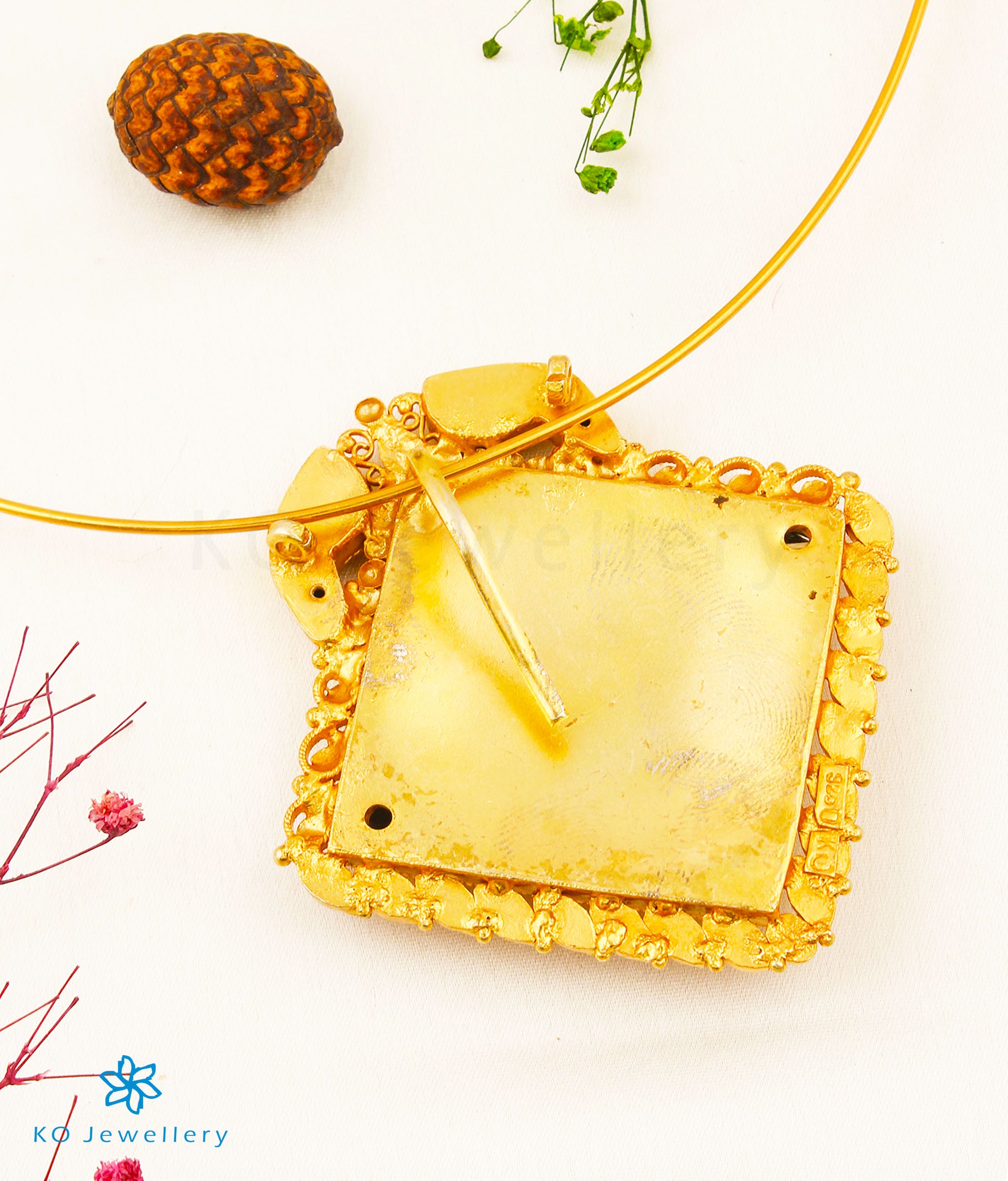 An intricate pendant from our antique temple jewellery collection with the figure of ' Makara' - (mythical sea-creature in Hindu mythology), at its center. This motif is widely used in temple architecture and jewellery and the two peacocks perched on top add to its beauty. Studded with `kempu' (red) stones the entire piece is crafted in pure Sterling Silver (92.5%) and dipped in 24 karat gold.