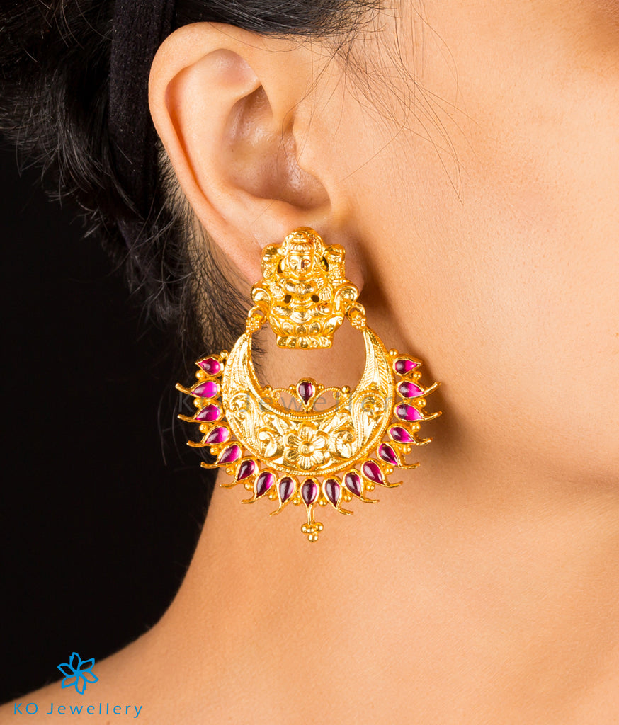 The beautiful goddess Lakshmi adorns this stunning pair of Sterling Silver (92.5%) earrings in the chand-bali style and is decorated with kempu stones. This unique handcrafted design will make a great addition to your collection. Crafted using techniques used in ancient South Indian antique gold temple jewellery the entire piece is crafted in silver and gold-dipped .