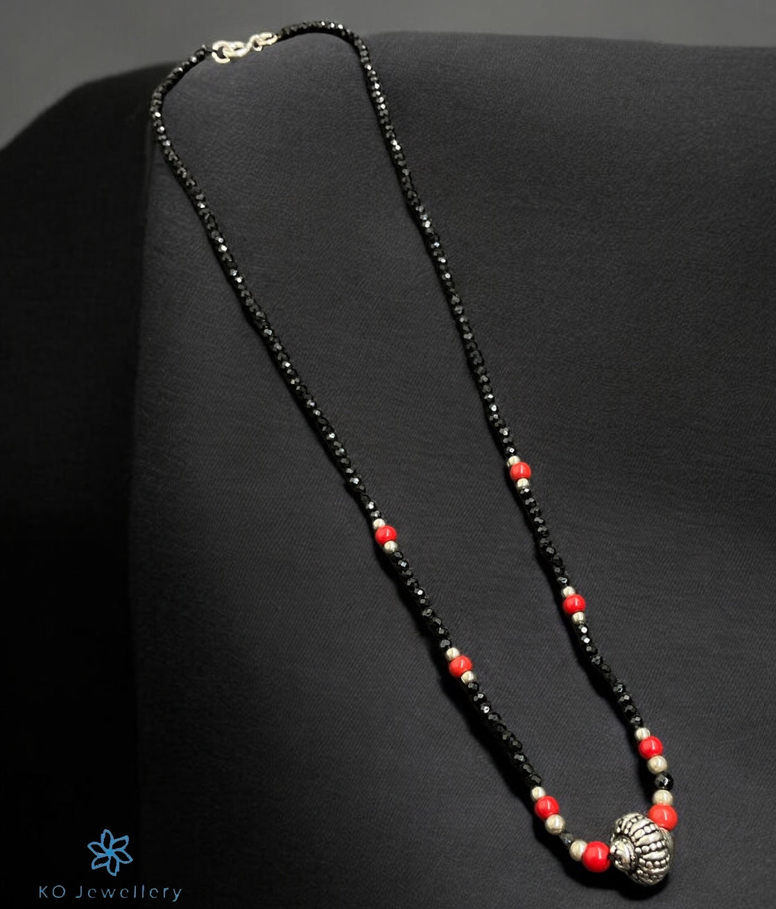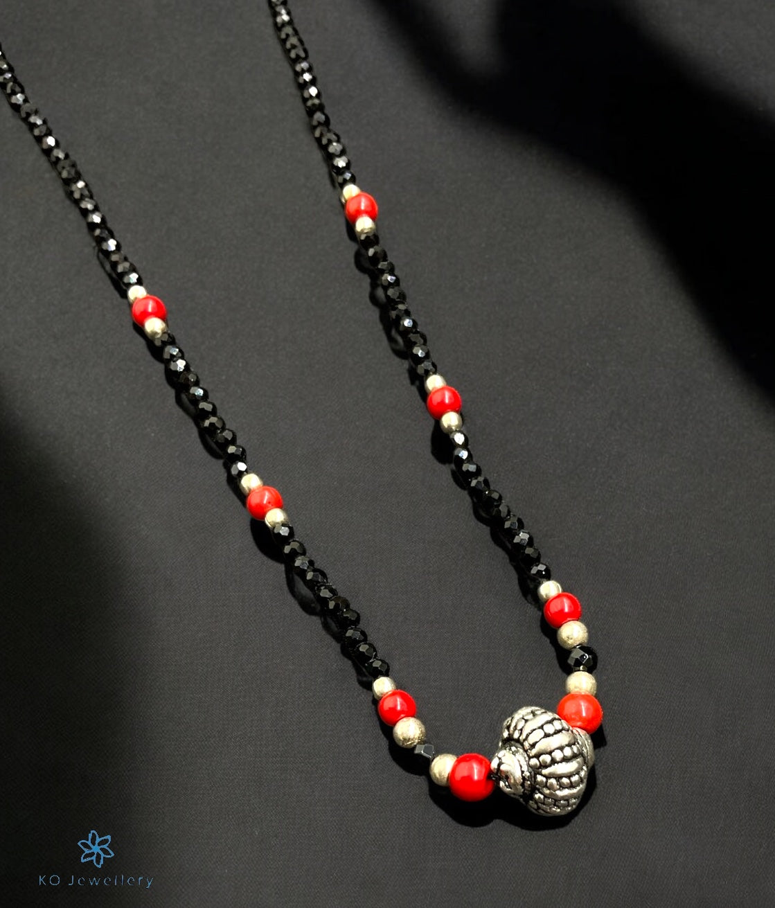 Add a unique handmade design to your collection with this necklace in which beautiful coral & black Onyx beads are used. Handcrafted in Pure Sterling Silver (92.5%) this necklace can be used as a mangalsutra or as a black bead necklace.