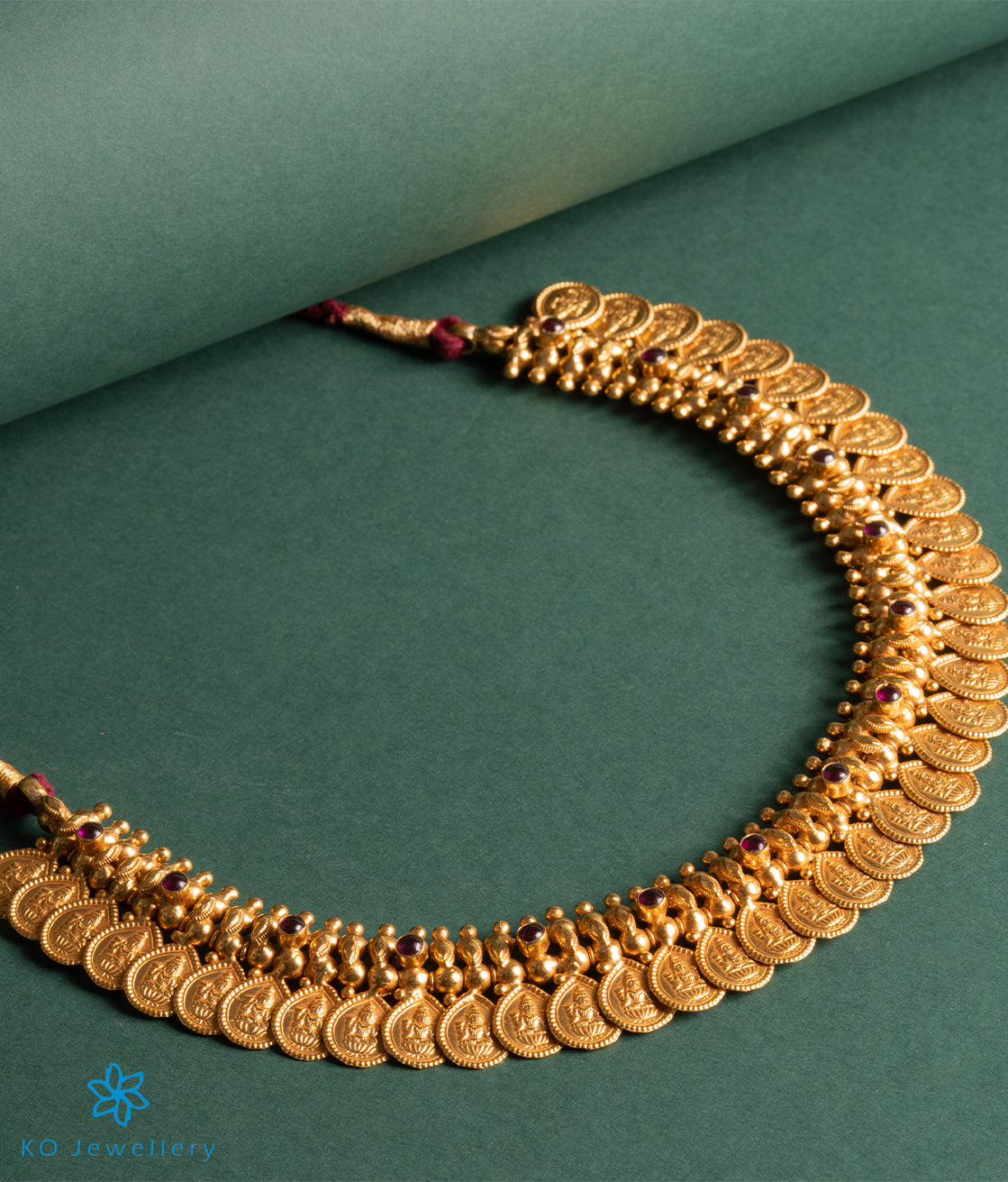 Closely resembling a traditional Indian `kasu-mala' or coin necklace, depicting Laxmi the goddess of wealth the Bhairavi necklace does differ in certain details.The shape of the coins here is oval not round and it is a closely fitting necklace like a choker. Crafted in pure silver and dipped in 24-carat gold it is part of the Temple Jewellery collection of KO and is crafted using techniques used in ancient South Indian antique jewellery. All pieces in this collection are crafted in Sterling (92.5) Silver and gold-dipped in a special process to give them an antique look. It has been paired with matching coin-motif jhumkas.