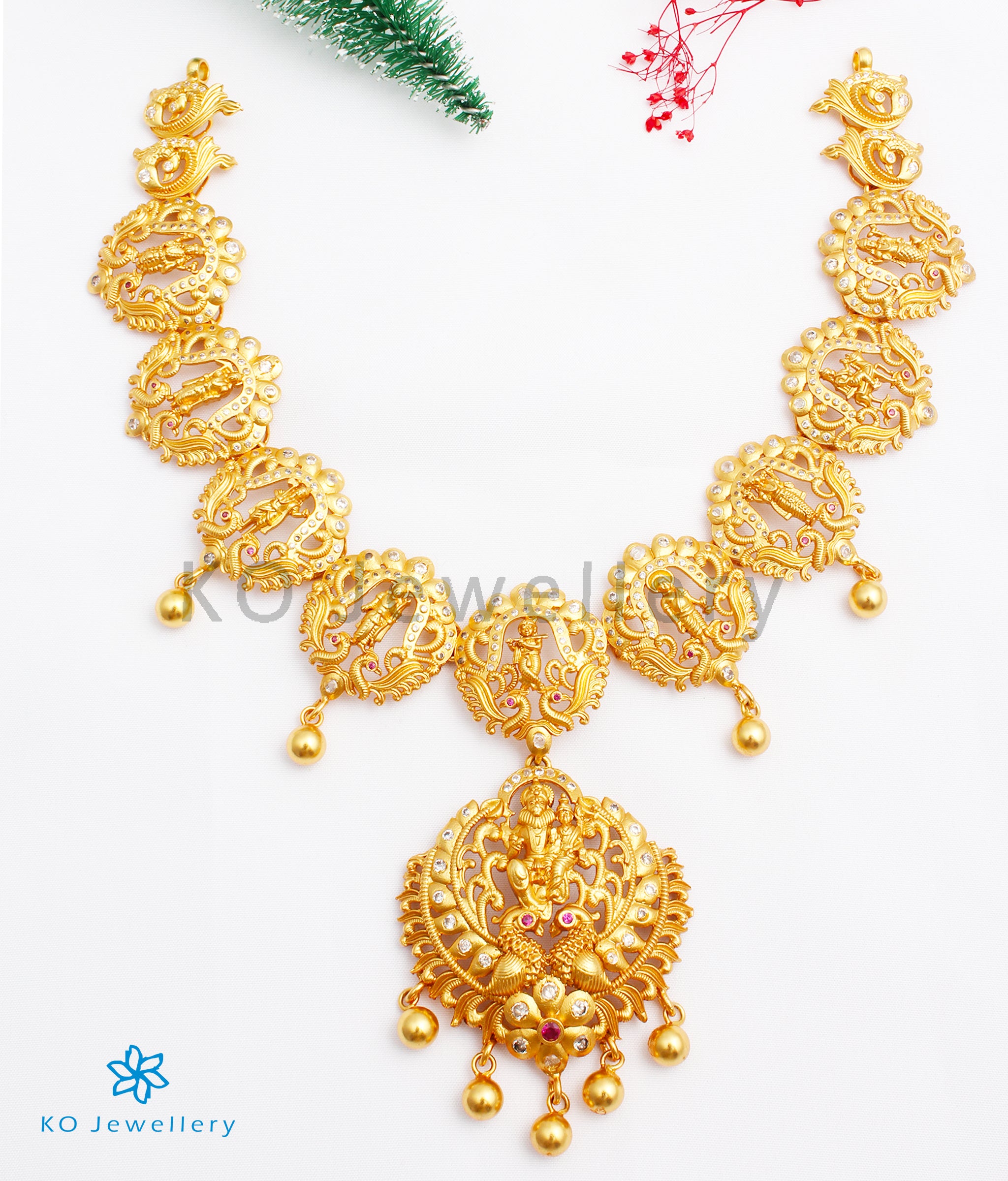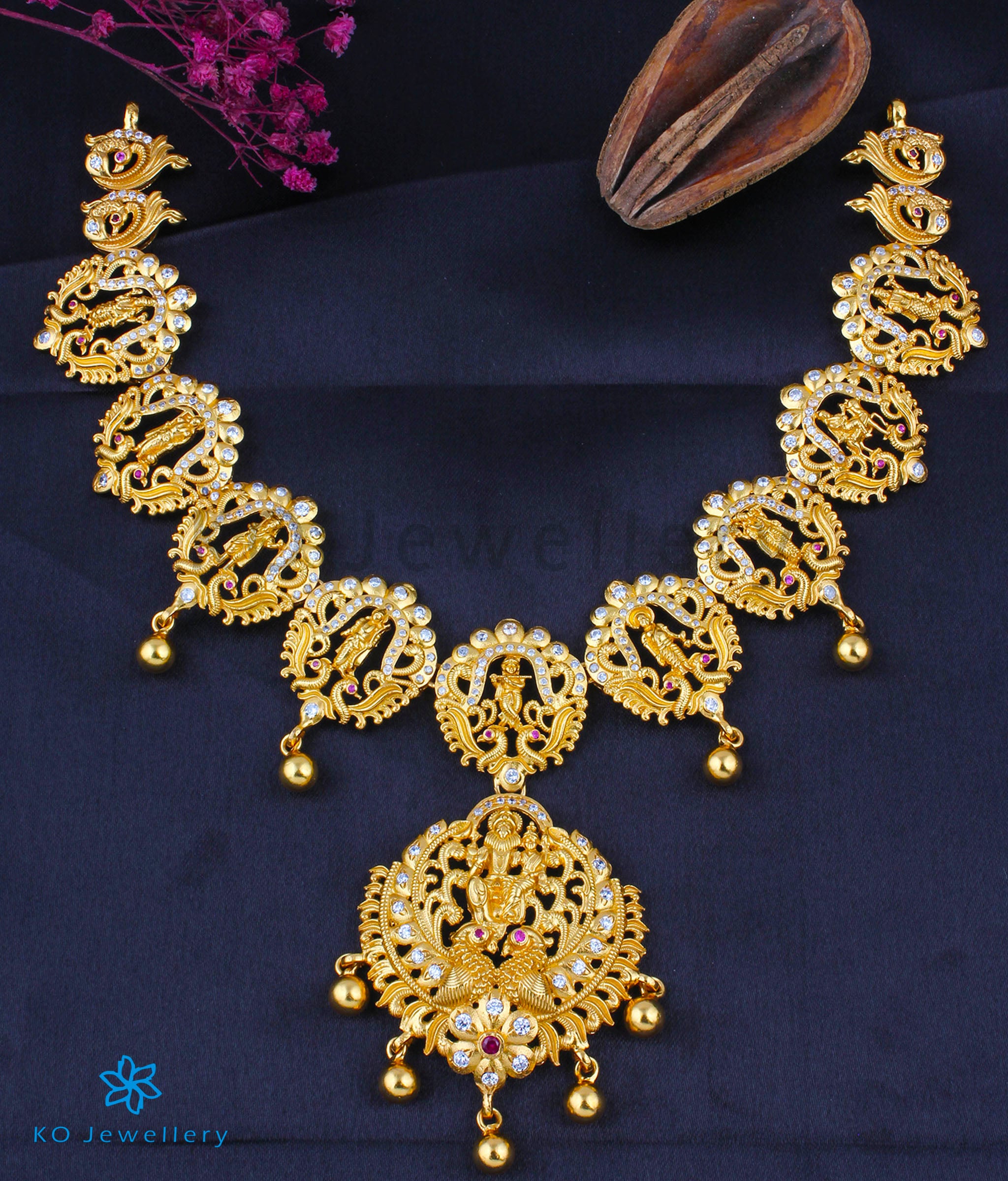 Designed using ancient techniques rooted in South Indian temple jewellery traditions, the piece mirrors the intricate craftsmanship once reserved for deities and royalty. Every curve and stone setting speaks of tradition, artistry, and devotion.