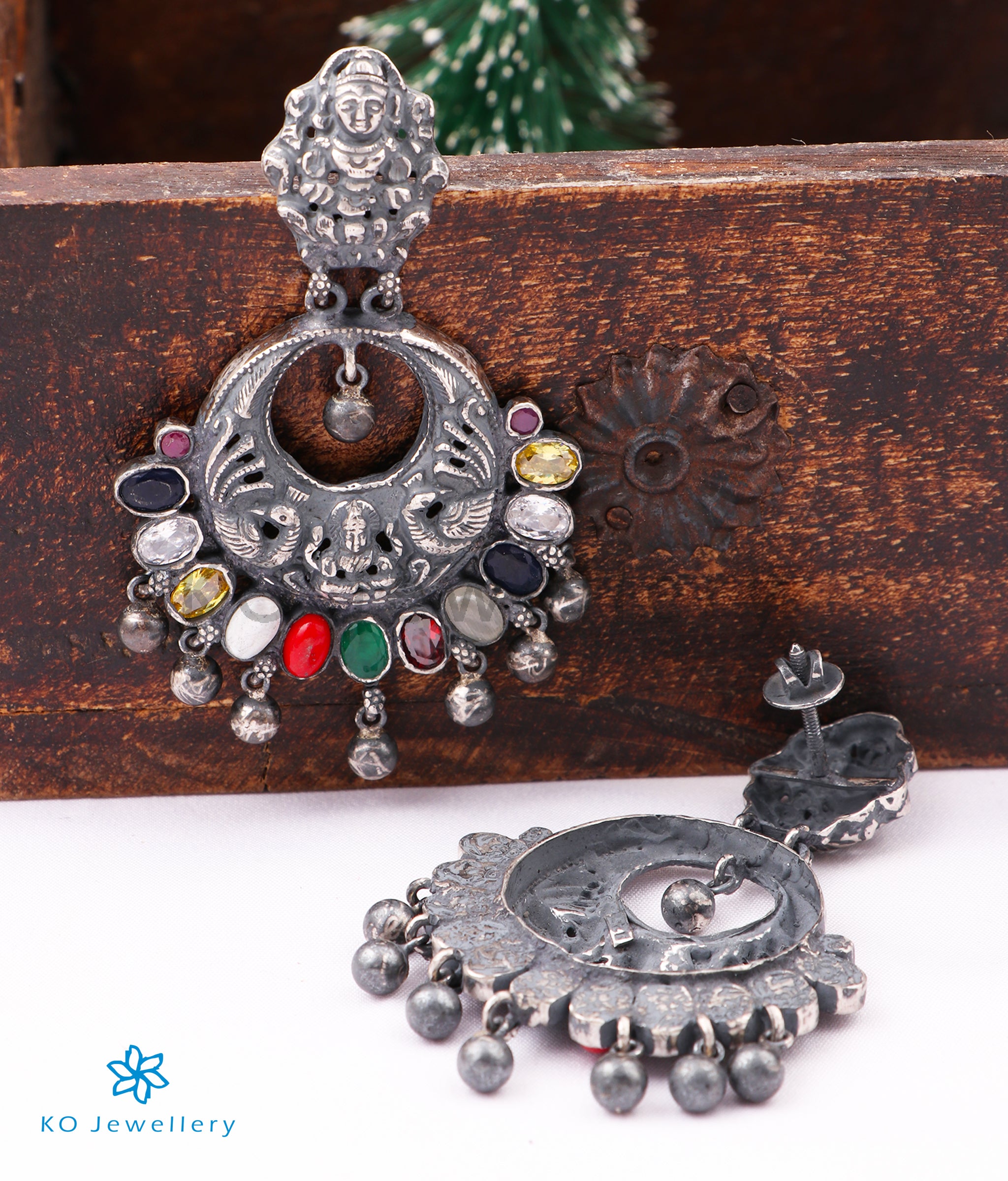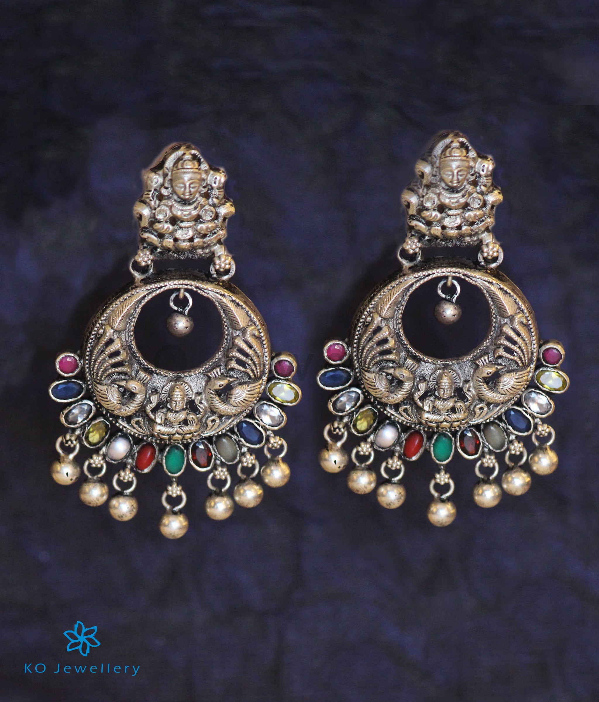 The Shraddha Antique Silver Navaratna Chand Bali (Oxidised)