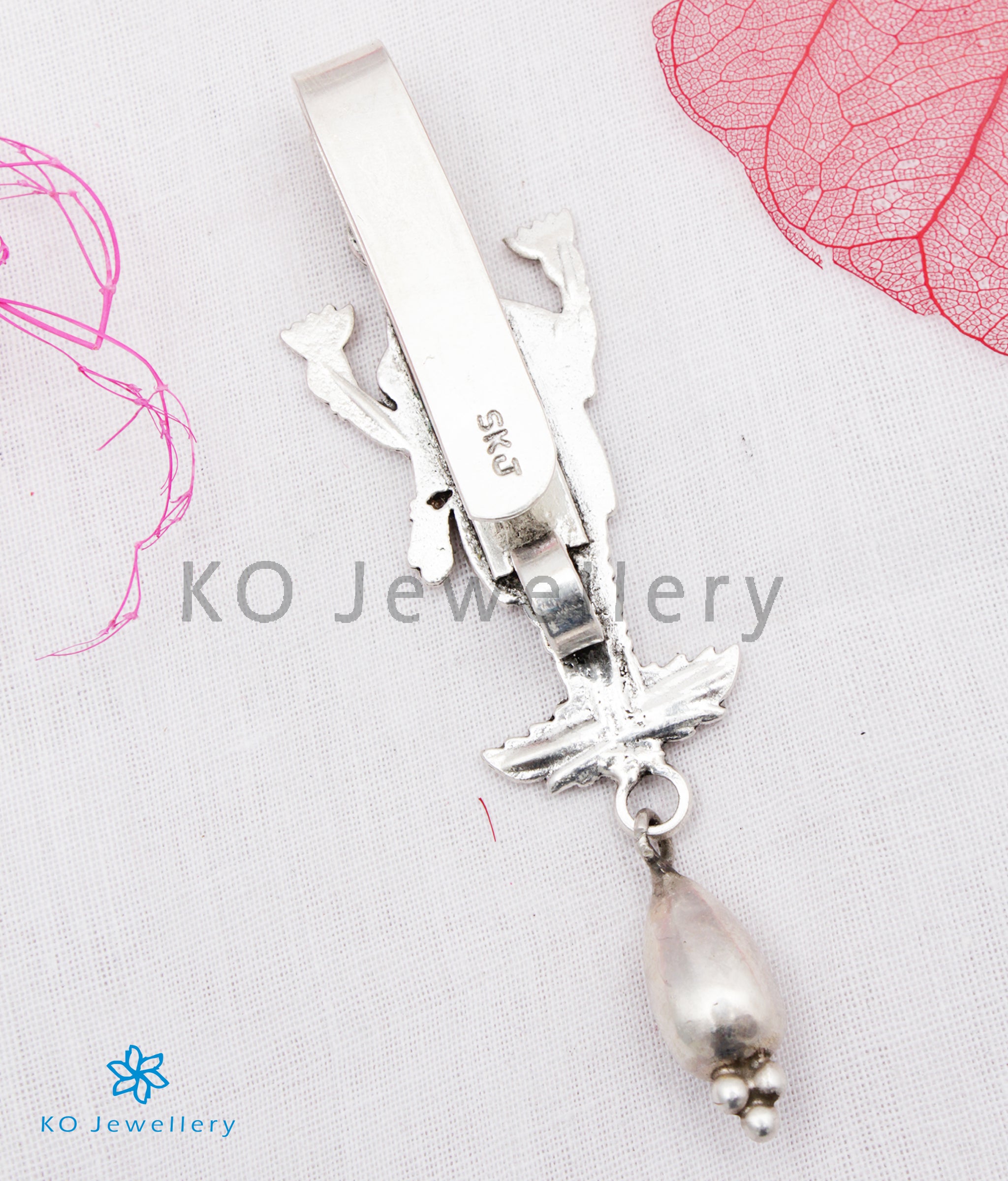 This is an ornamental 'Chabi challa' or waist key-chain for women handcrafted in Silver. It has an image of Godess Lakshmi on it whichmakes it all the more auspicious. Worn by women on their waist tucked into their saree this key chain can be used to hold several keys.