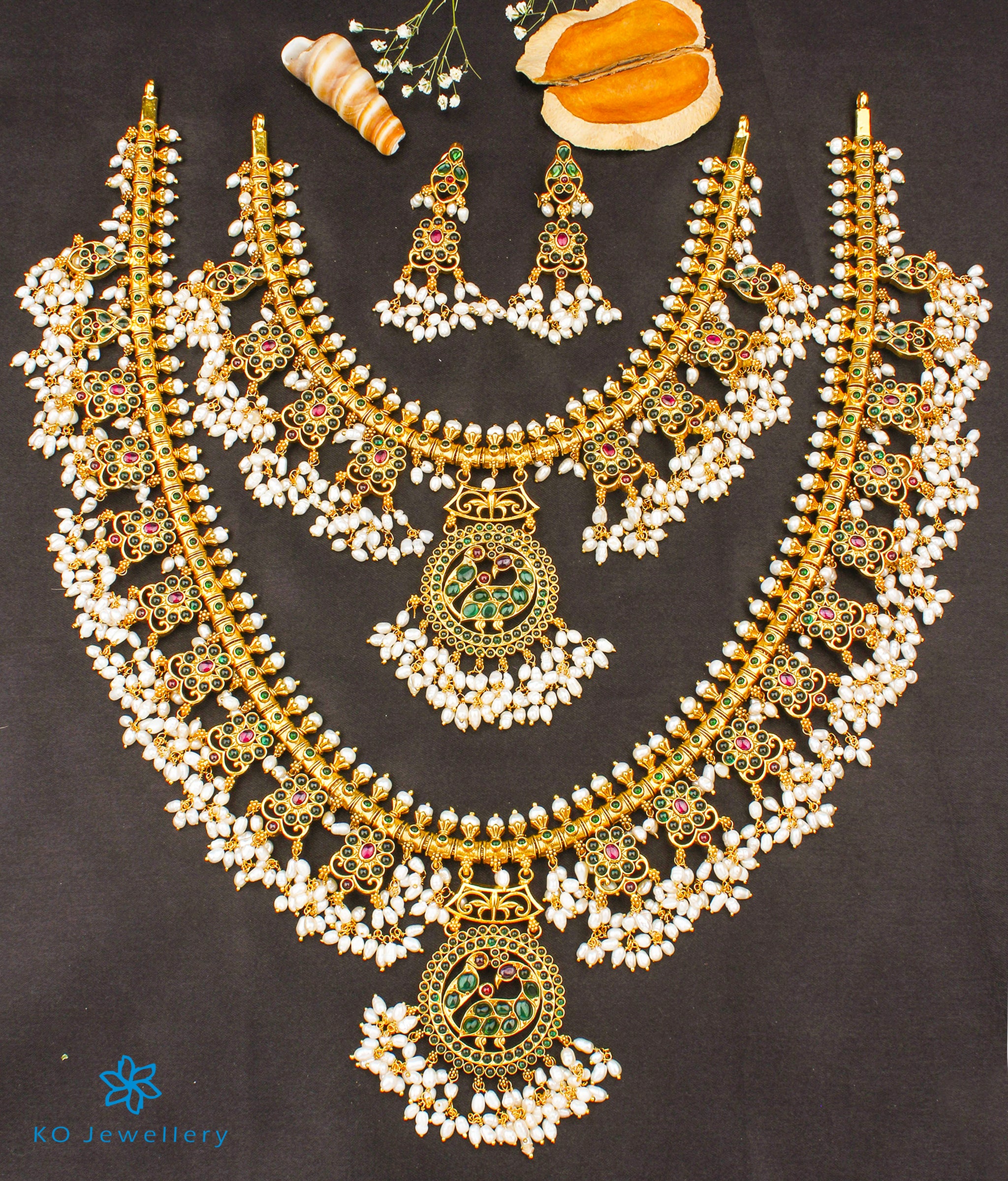 A classic heritage design from Andhra Pradesh, the Guttapusalu gets its name from its signature fringe — clusters of tiny pearls that resemble “a shoal of small fish” (gutta). Pusalu translates to beads, a nod to its origin near the ancient pearl-fishing regions along the Coromandel Coast.