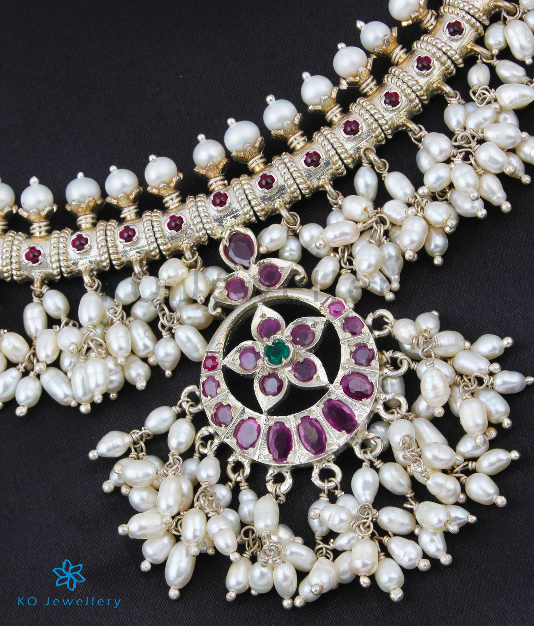 If you want to stun everyone with a bespoke piece of jewellery this is the design for you. This heritage necklace carries five pendants with kempu stones and is decorated with natural Pearl.