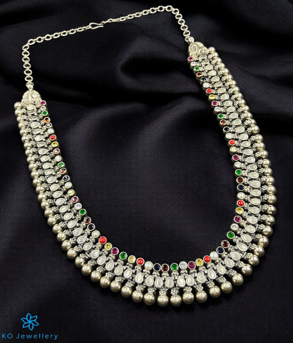 Discover the perfect blend of design symmetry and artisanal craftsmanship with our Handcrafted necklace adorned with the vibrant Navarathna gemstones. This stunning piece is made from pure 92.5% Sterling Silver, ensuring lasting quality and shine, and is lightly oxidised for a rich, antique-inspired finish that radiates timeless charm.