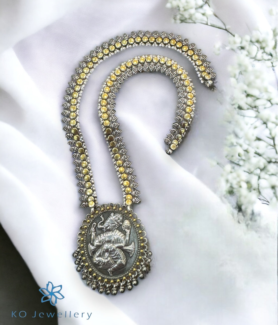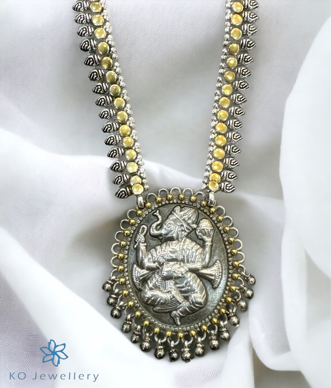 Flaunt a silver necklace that represents a fusion of ethnic design, contemporary aesthetics and excellent craftsmanship .The center-piece of this necklace is its intricate Ganesha pendant that is finely detailed with a 2 tone gold/silver finish. The entire necklace is handcrafted in sterling silver (92.5%) and makes for a beautiful accessory.