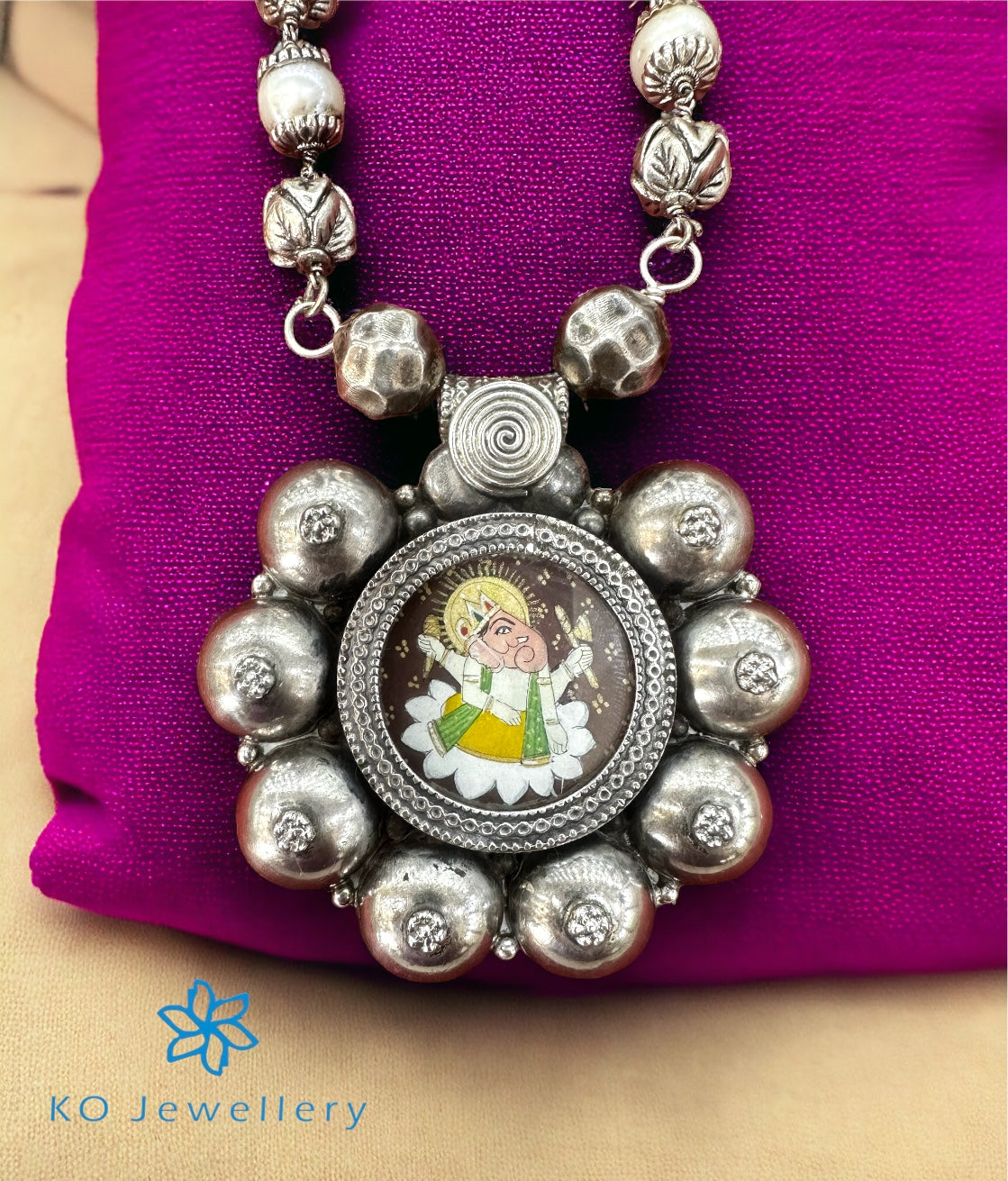 A beautiful hand painted Ganesha painting enclosed in an ornate design Silver pendant forms the center-piece of this Sterling Silver (92.5%) necklace. The necklace string is made up of natural pearl and ornate design silver beads handwoven in silver wire. Wear it if you want to flaunt a great piece of statement jewellery.