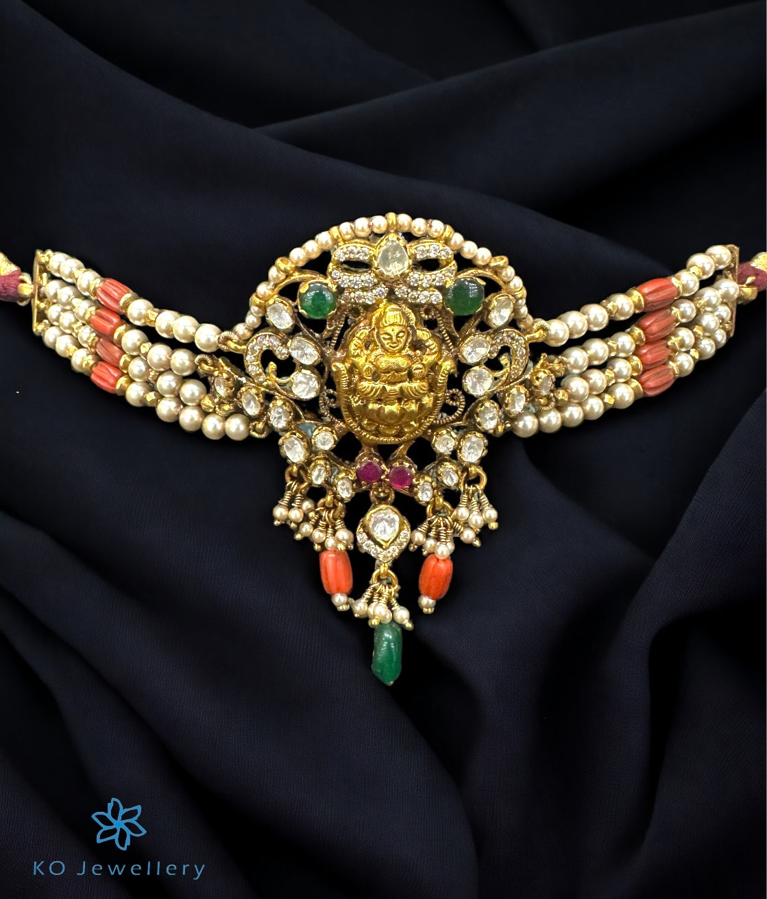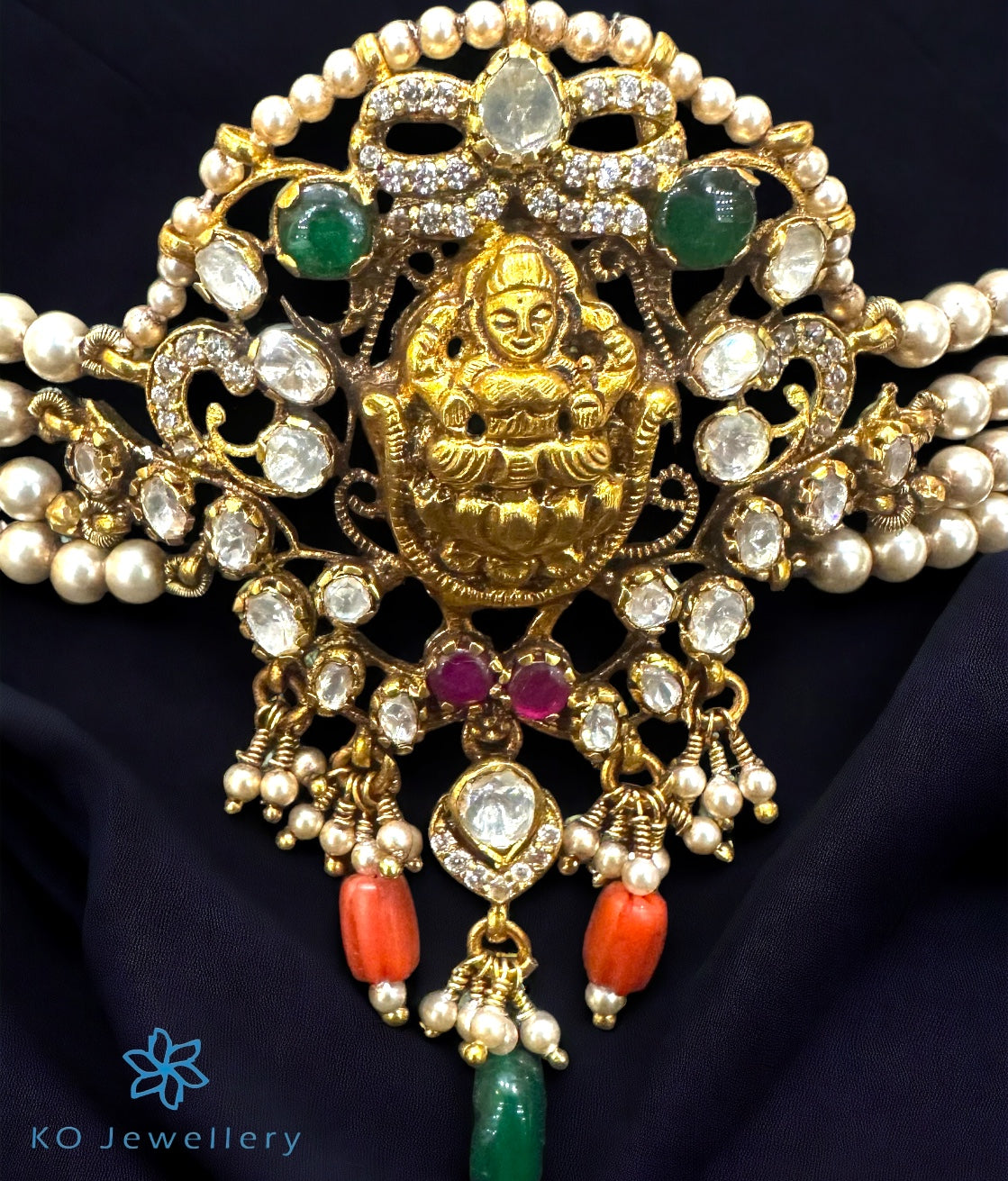 A magnificent design that will surely put all the attention on you , this gold-dipped sterling silver (92.5%) necklace crafted in the kundan-jadau technique is truly unique. The elaborate image of Lakshmi is surrounded with polki stones, strings of pearl and coral beads .The entire piece is crafted in pure silver and dipped in 24 karat gold.