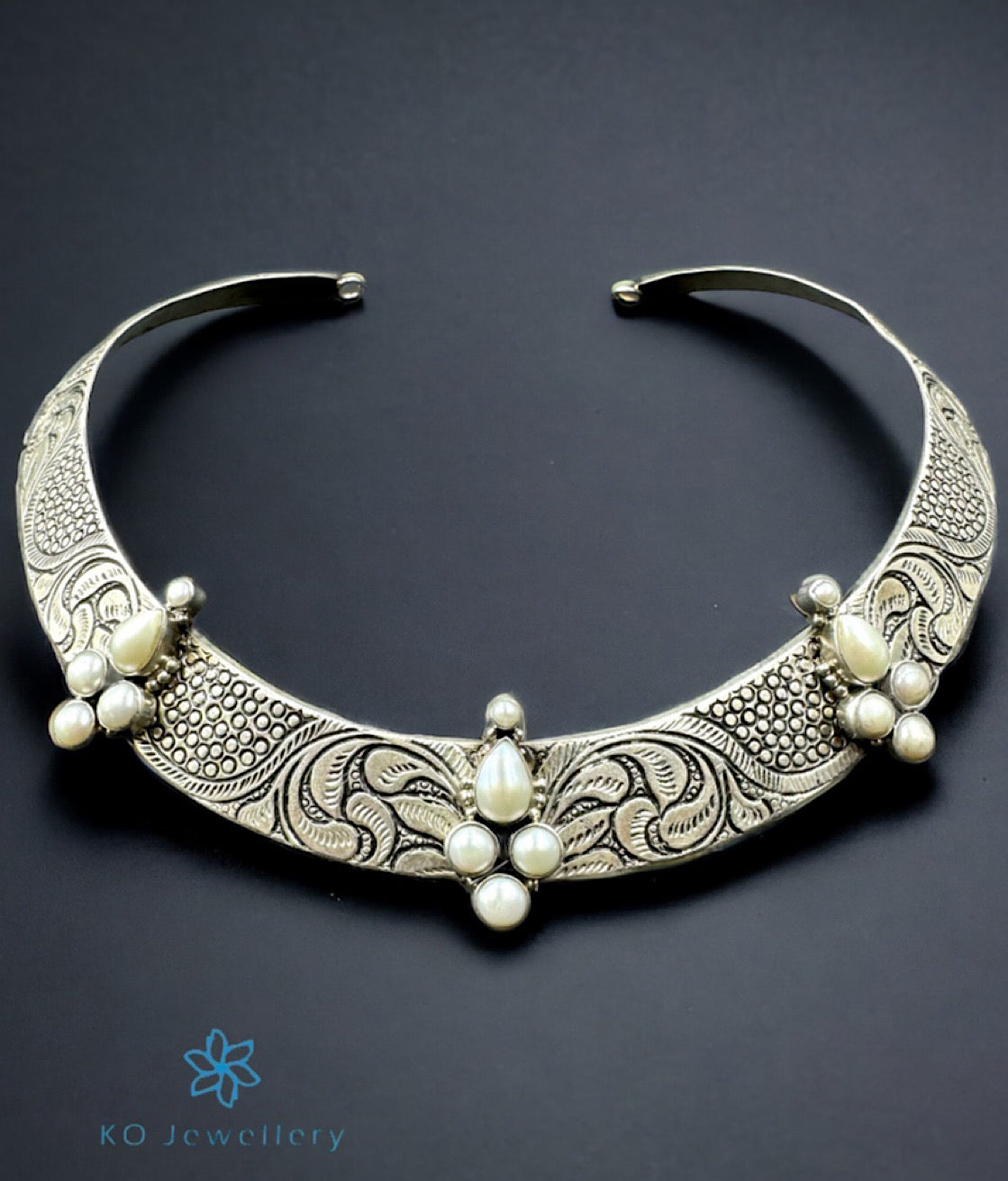 The necklace has an attractive etched design on its body and is decorated with Pearl pendants. The entire necklace is handcrafted in sterling silver (92.5%) and makes for a beautiful accessory.