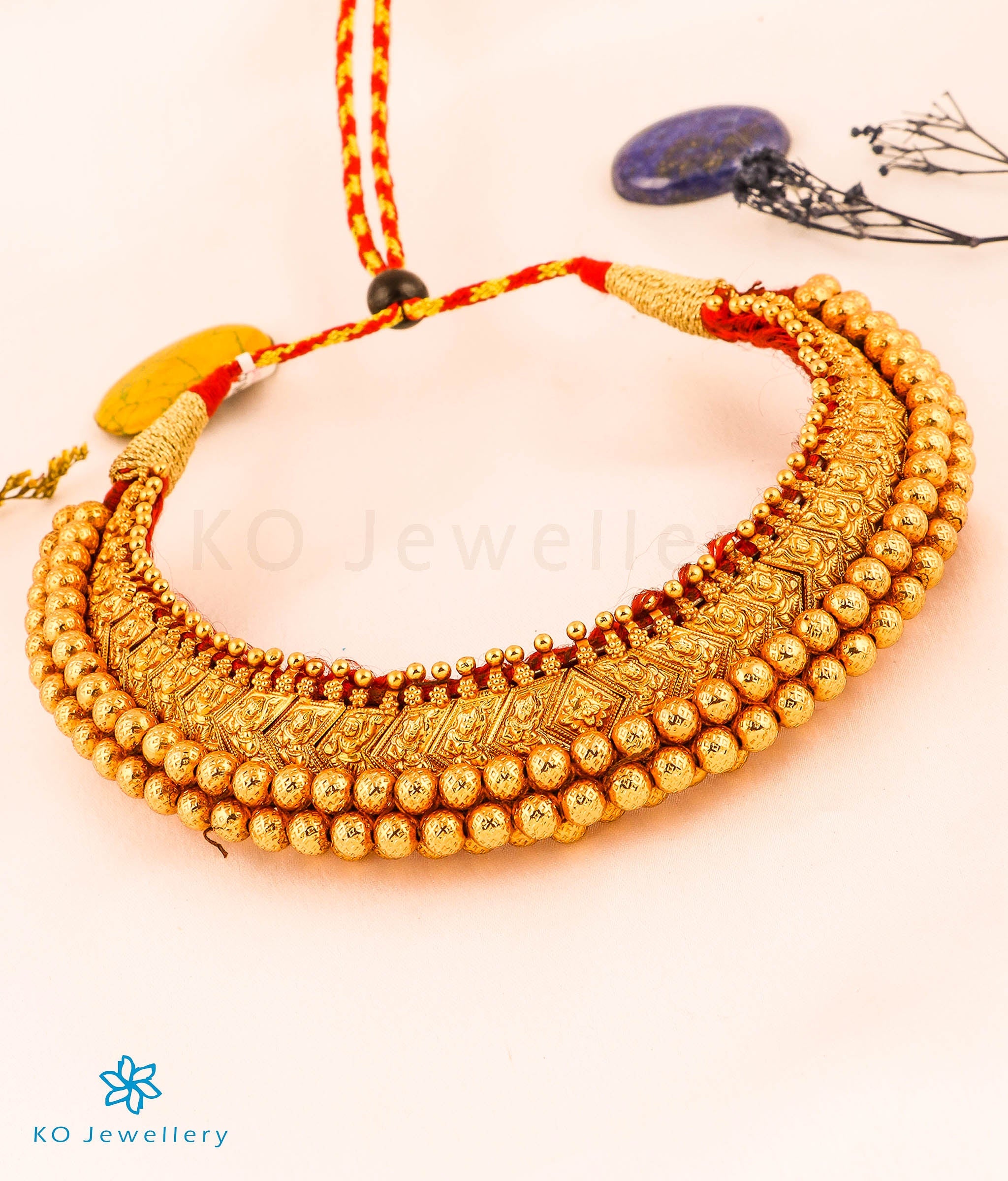 This is a traditional design `tussi or thushi necklace' with silver beads and stamped silver units. Called `tussi' due to the intricate handmade thread-work involved, in this necklace handcrafted designs made of Sterling Silver (92.5%) are woven onto thread to give the necklace a stiff-choker design.