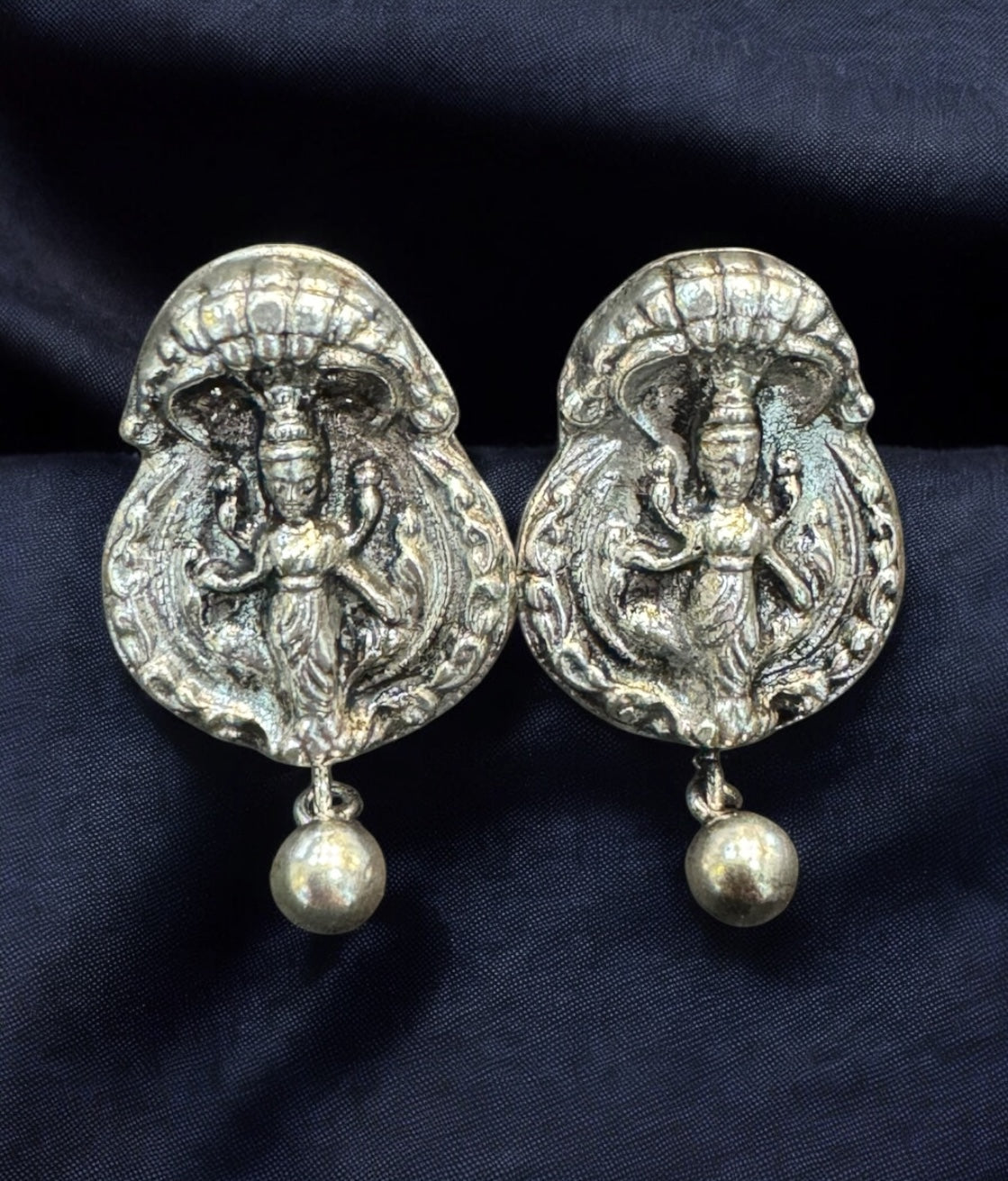 Adorn yourself with a stunning symbol of divine abundance – this handcrafted 925 Silver Lakshmi Necklace & Earrings features the Goddess Lakshmi standing under Adisesha the multi-headed serpent deity. Meticulously handcrafted by skilled artisans, this is a traditional Lakshmi pendant with `nakkasi' or `nakshi' work (a form of gilt and repousse technique unique to south Indian temple jewellery). The lovely kemp stone detailing adds a beautiful touch to this vintage design pendant that is one of the most popular designs.