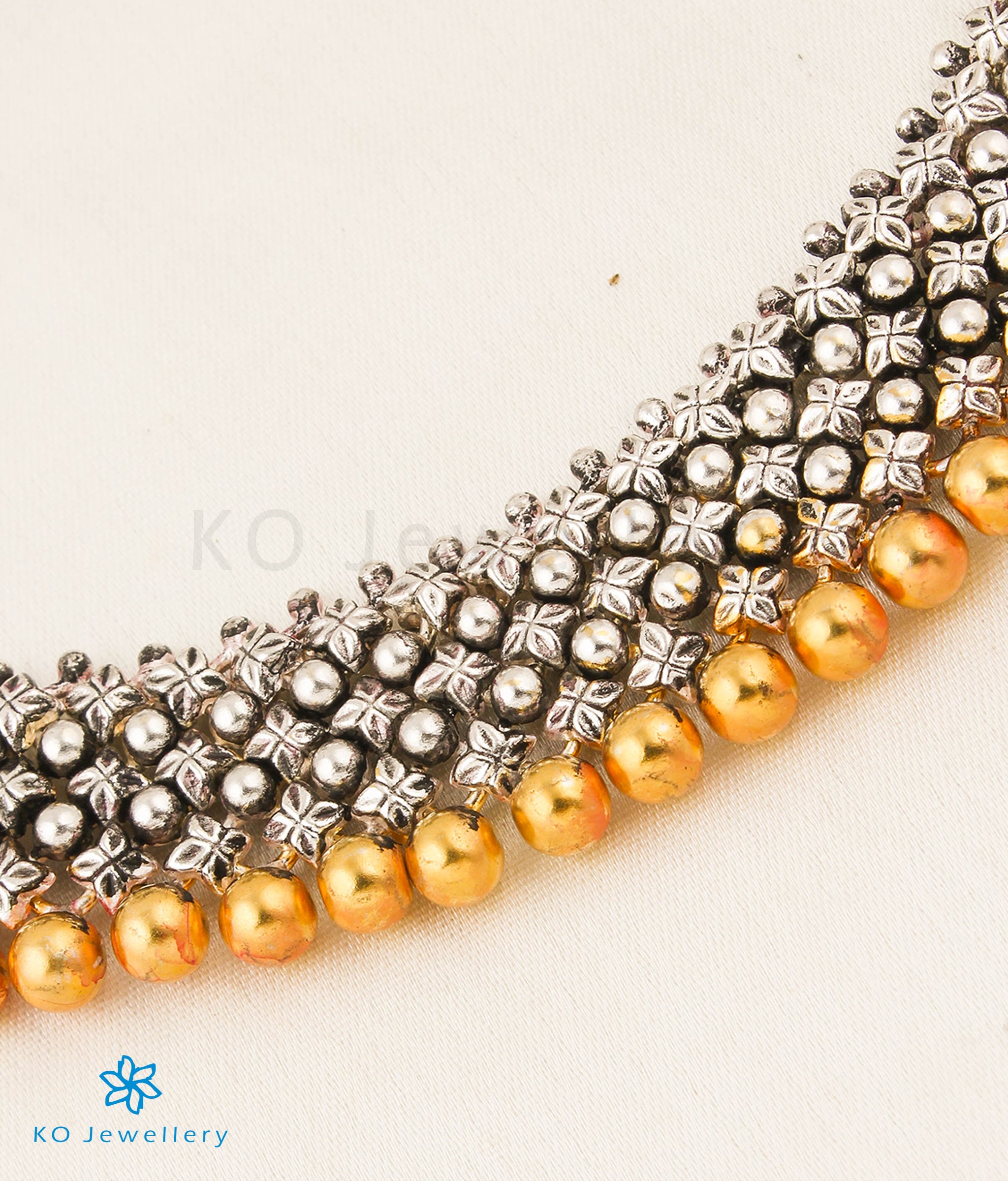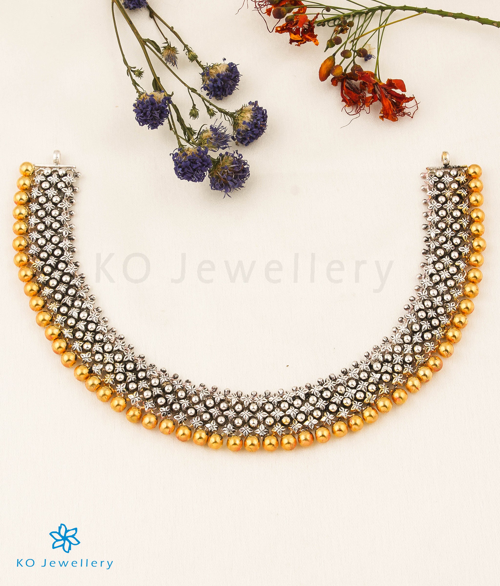 The skill and craftsmanship exhibited in this piece is truly amazing. Crafted using techniques used in South Indian antique jewellery, this is a versatile piece that can be paired with indian or western outfits.The two-tone gold/silver finish enhances its appeal.