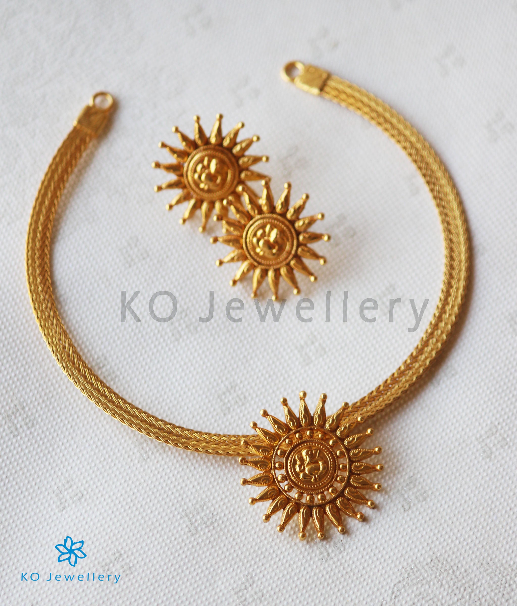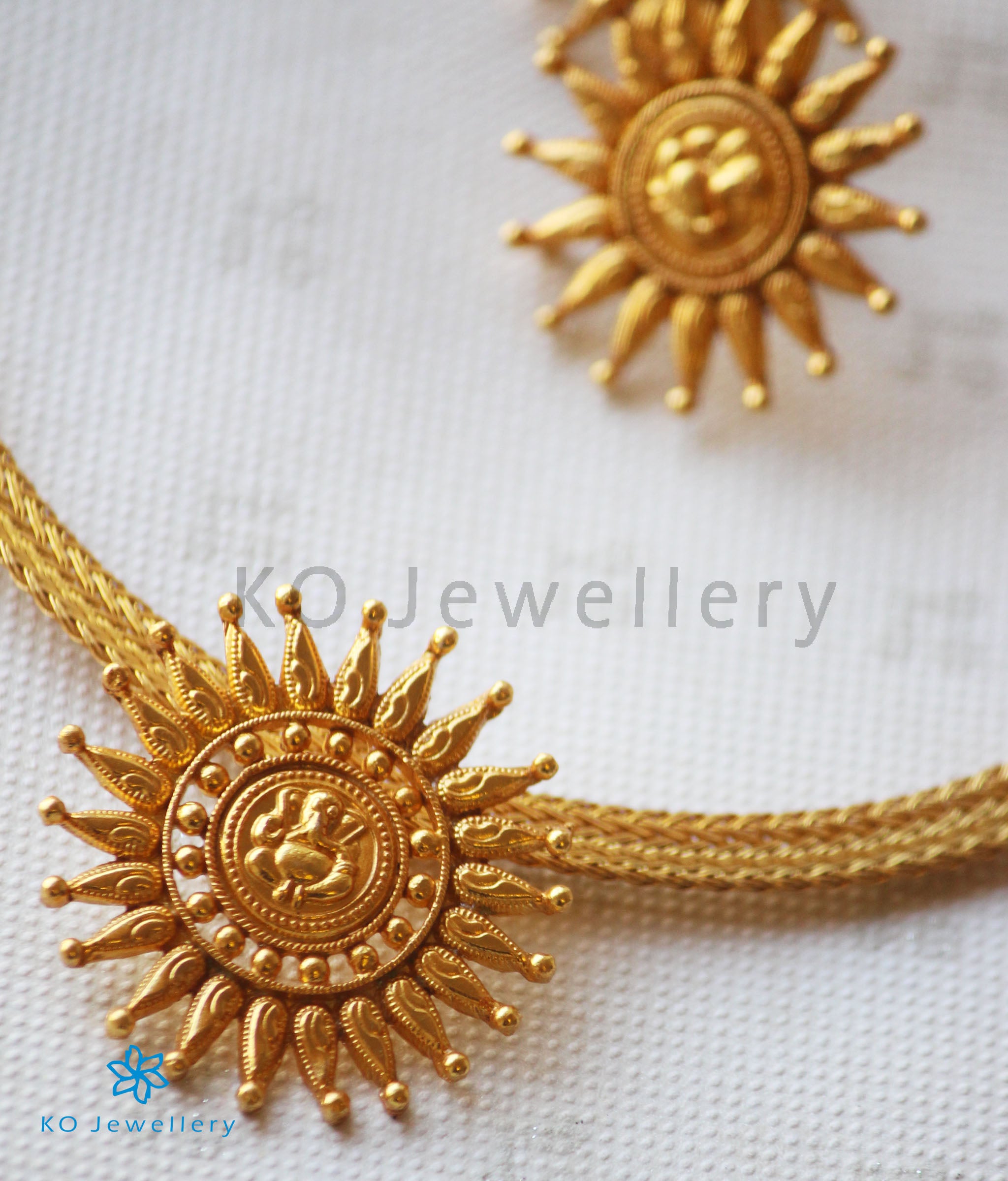 An ornate pendant with the image of Ganesha surrounded by intricate detailing.The entire piece is crafted in pure Sterling Silver (92.5%) and gold dipped. It is paired with matching earrings that come with a bombay screw and is hung on a short, and flat gold dipped chain.