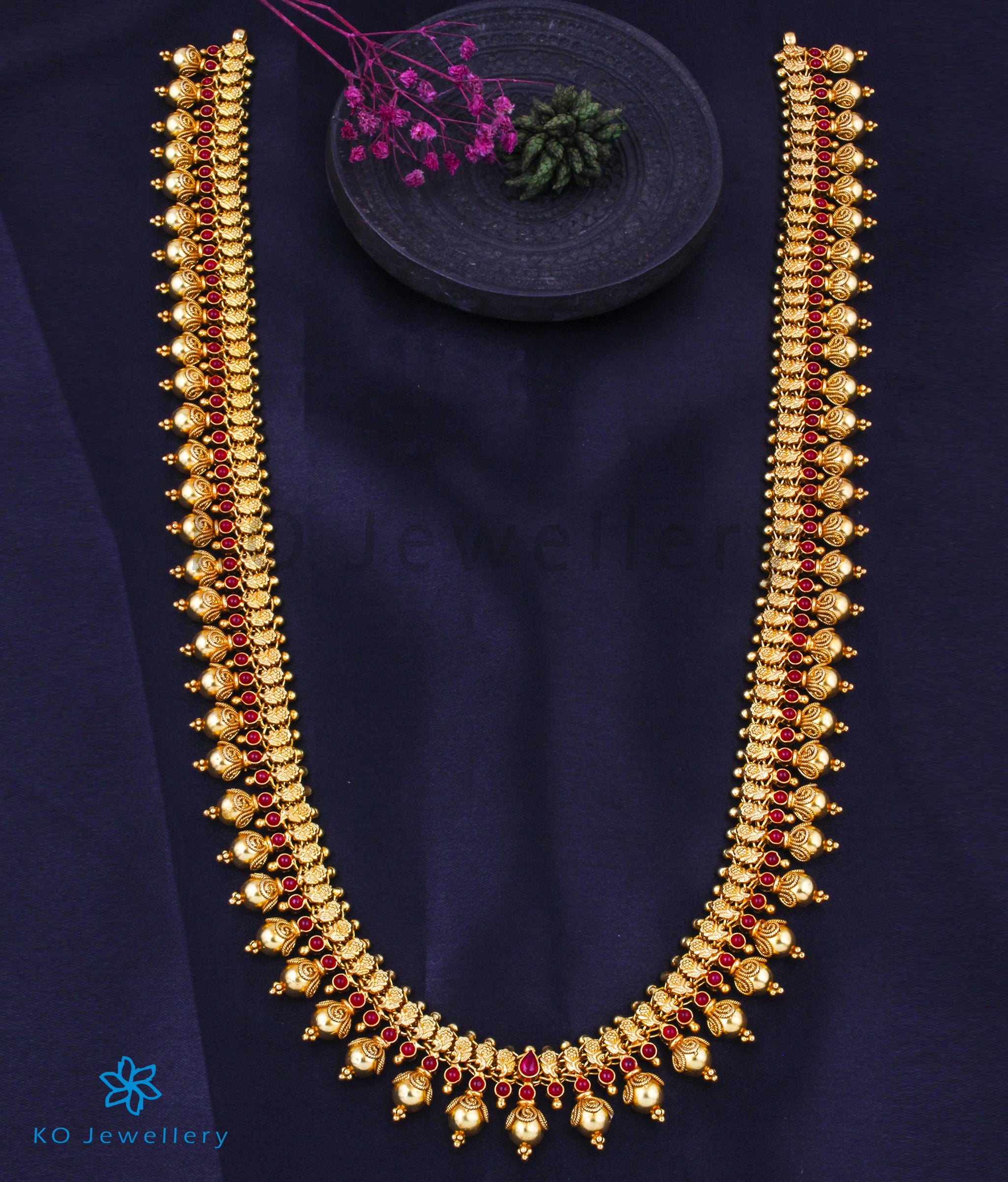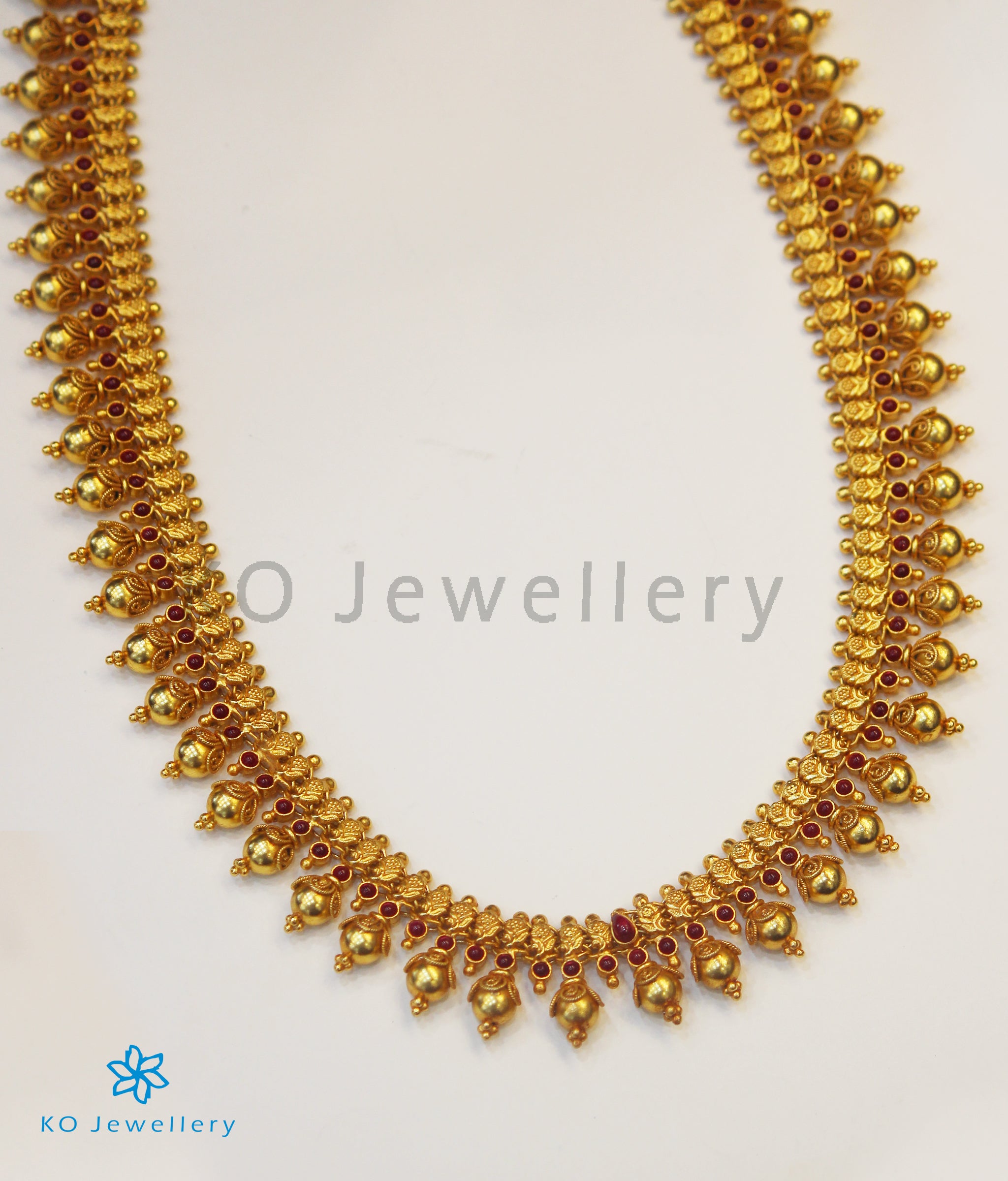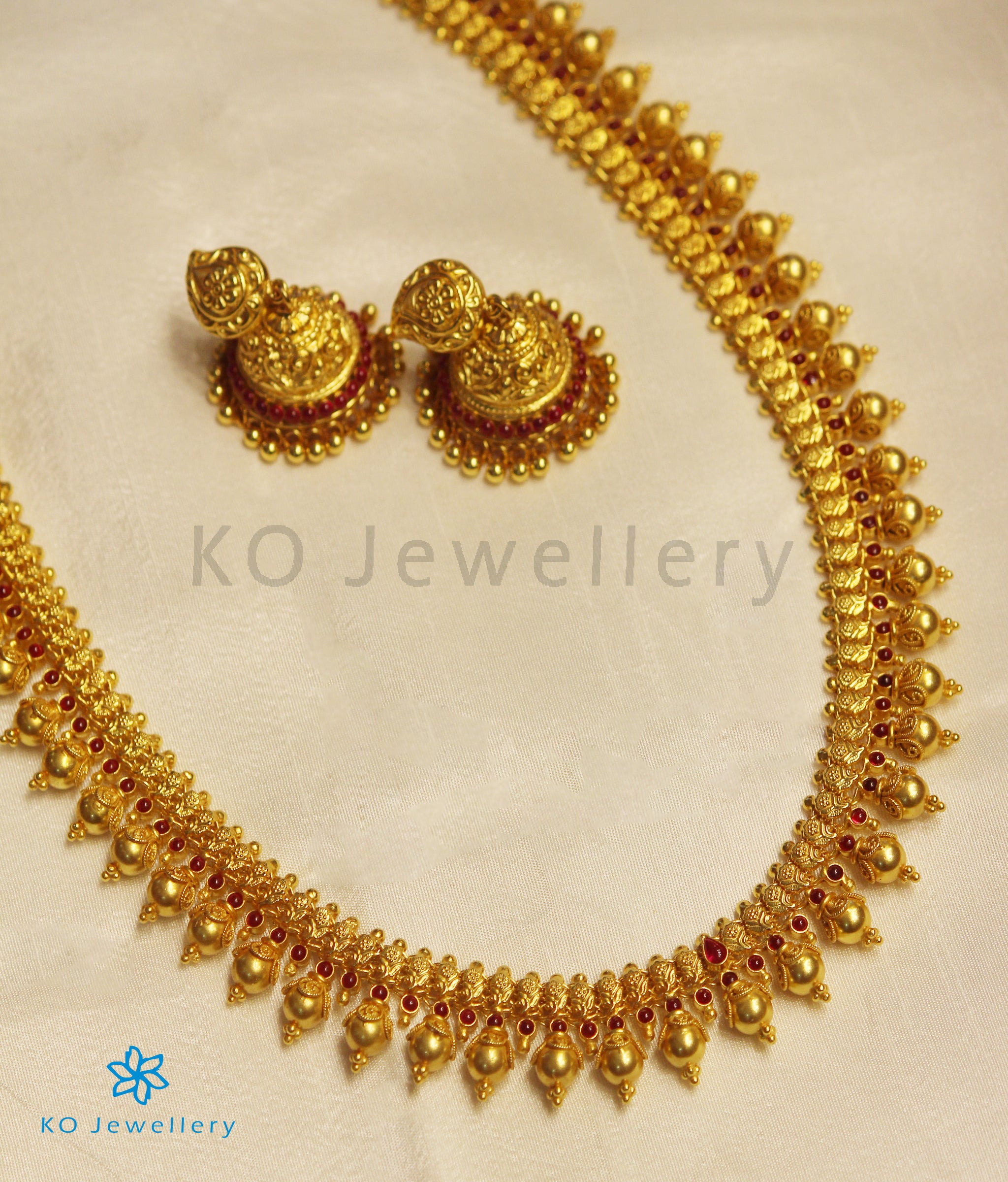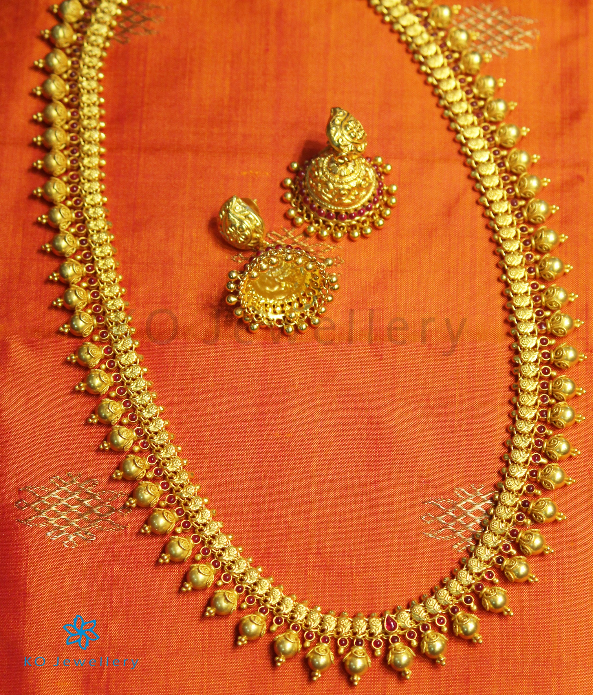 A long necklace with a classic design crafted in sterling silver (92.5%) this piece can be paired with any outfit. Pure, unique, handmade and gorgeous it is crafted using techniques used in ancient South Indian antique jewellery.It has been paired with matching jhumkas.