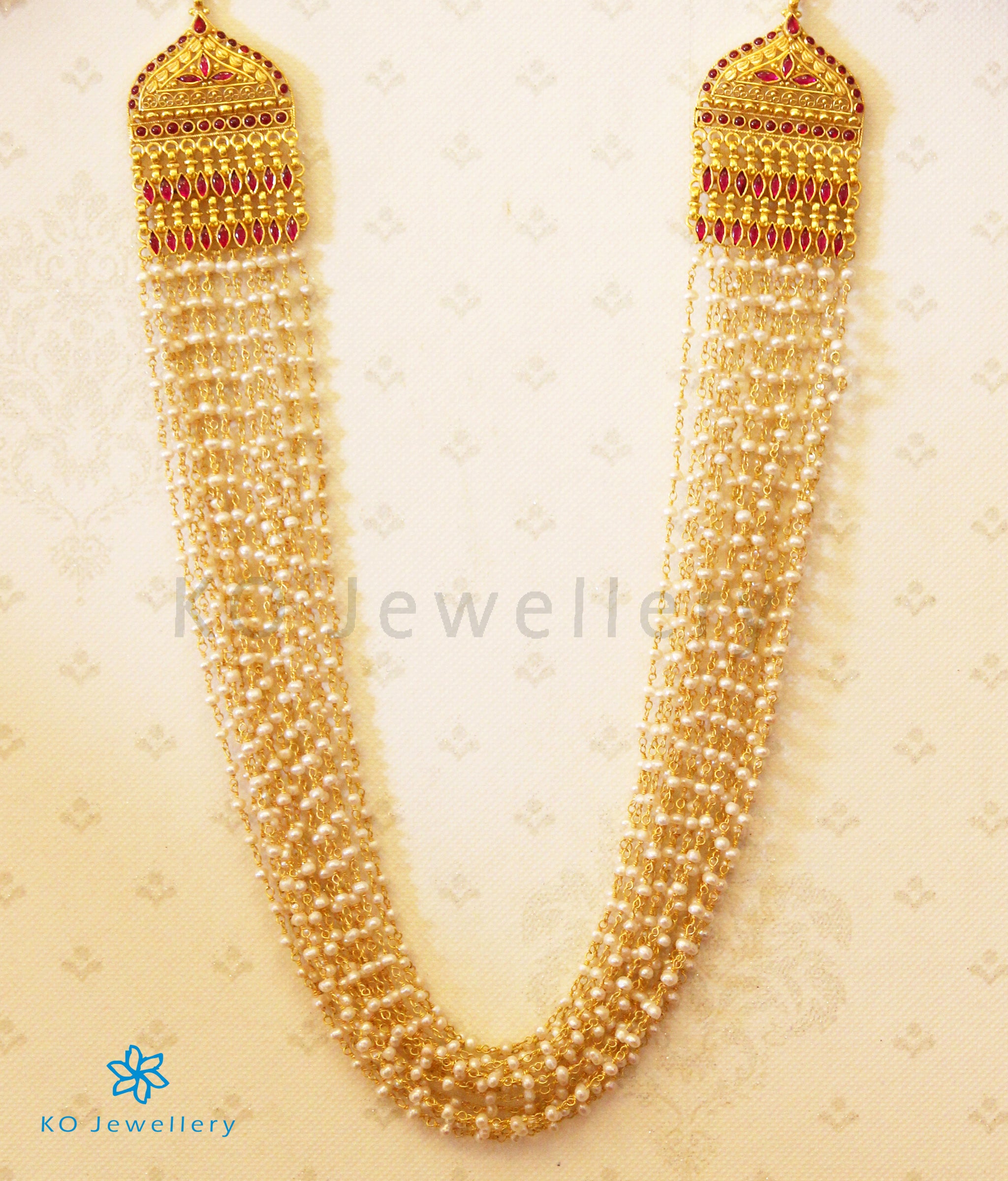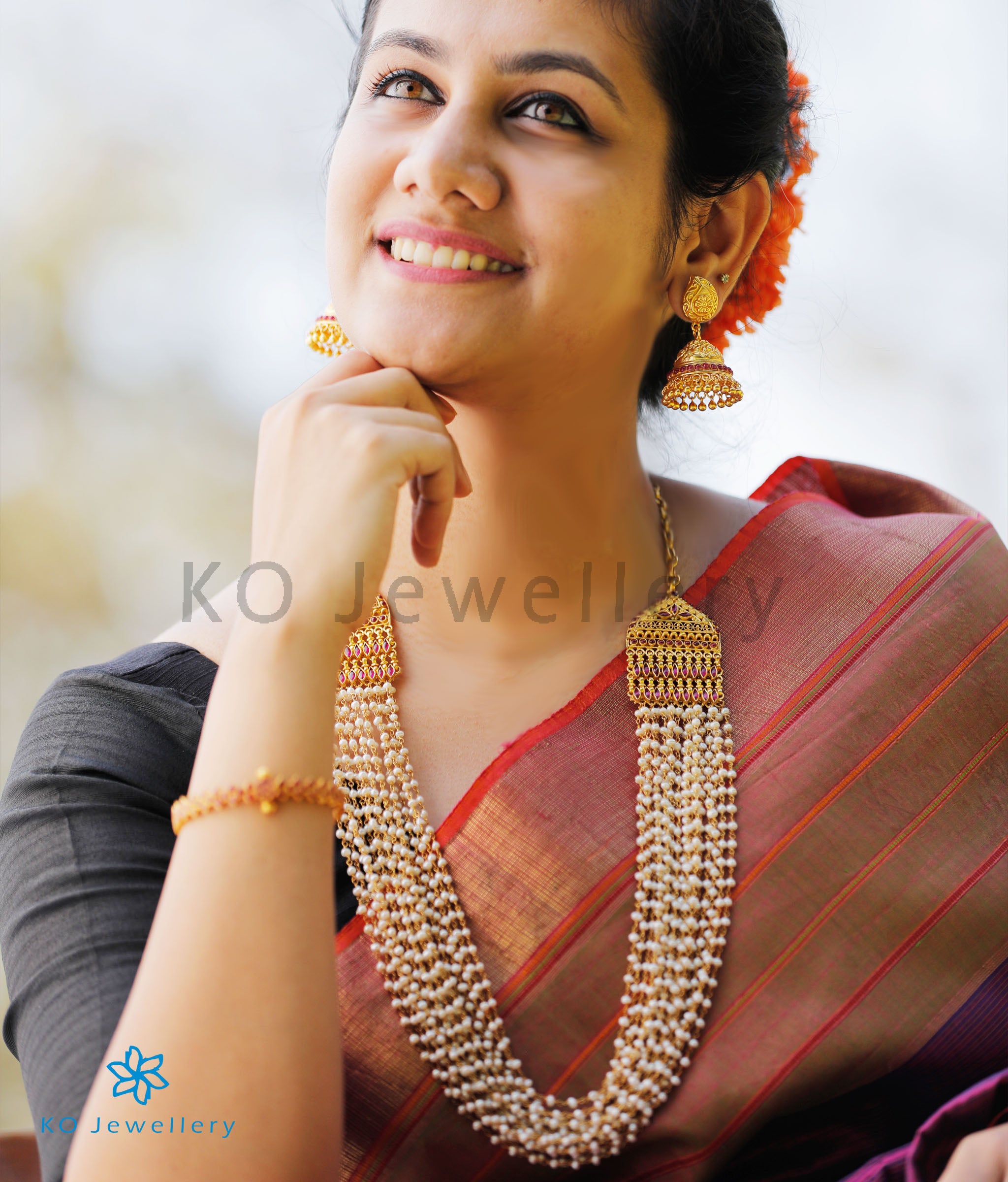 Delicate and feminine this necklace made up of dreamy pearls linked together with Sterling Silver (92.5%) wire is sure to steal your heart. It is made up of 18 strands that are arranged in layers and comes with a pair of matching earrings. The Pearl strands are held in place by two ornate pendants set with kempu stones.