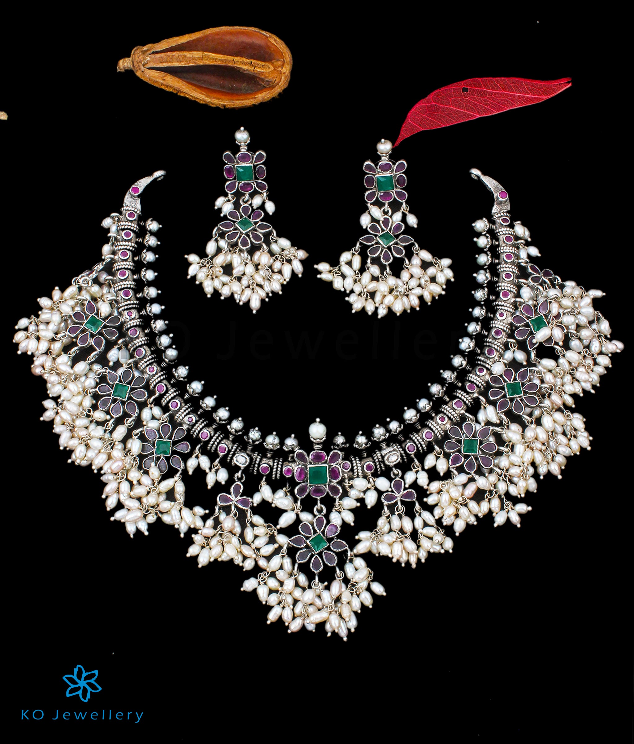 This gorgeous piece of heritage jewellery will put a glow on your face .The Gutta Pusalu is a classic design from Andhra Pradesh and is named so because the necklace is fringed with bunches of small pearls very similar to "a shoal of small fish" (gutta) .Pusalu means "beads" and this design originated in areas close to the ancient pearl fisheries along the Coromandel coast of India.