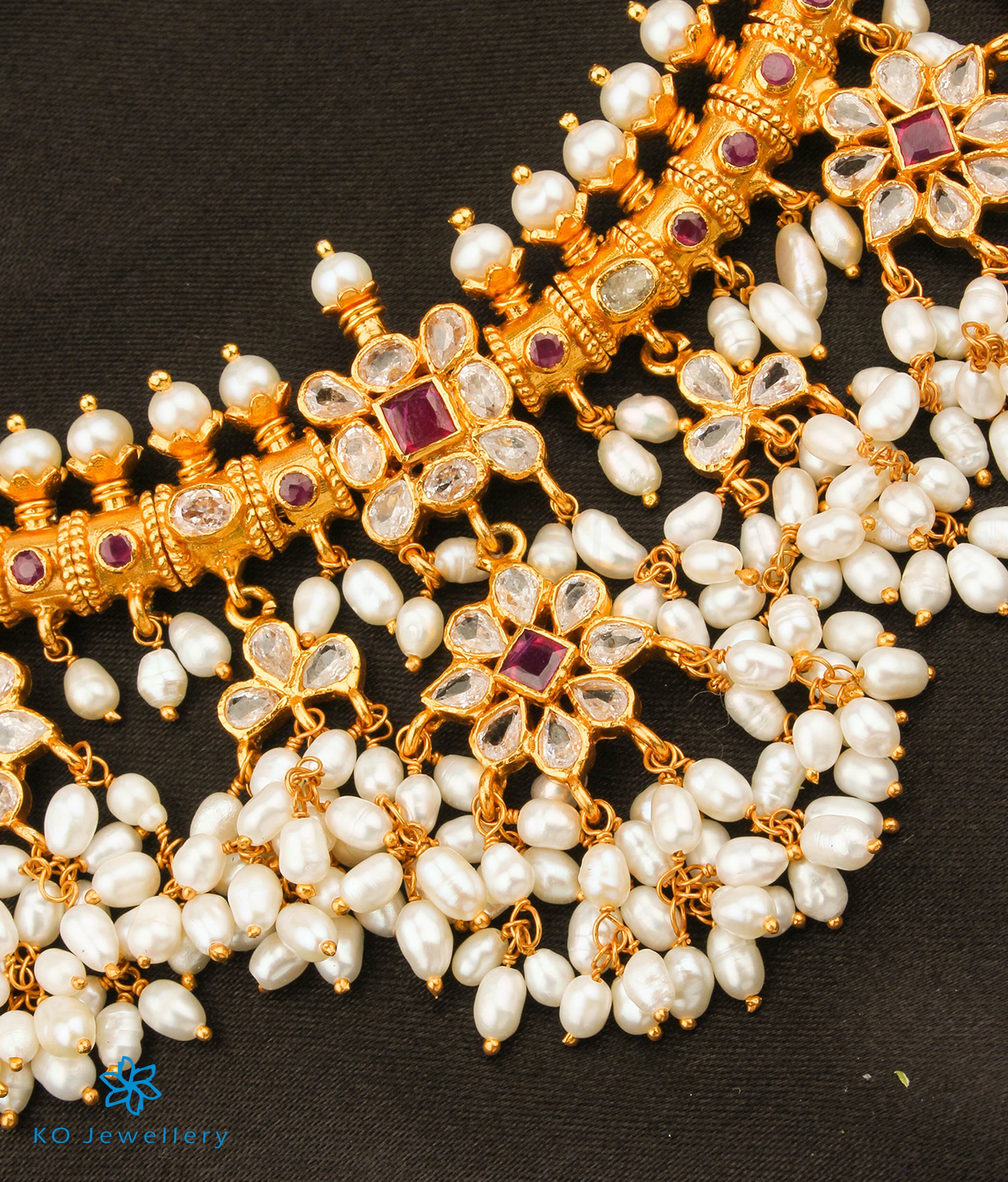 This gorgeous piece of heritage jewellery will put a glow on your face .The Gutta Pusalu is a classic design from Andhra Pradesh and is named so because the necklace is fringed with bunches of small pearls very similar to "a shoal of small fish" (gutta) .Pusalu means "beads" and this design originated in areas close to the ancient pearl fisheries along the Coromandel coast of India.