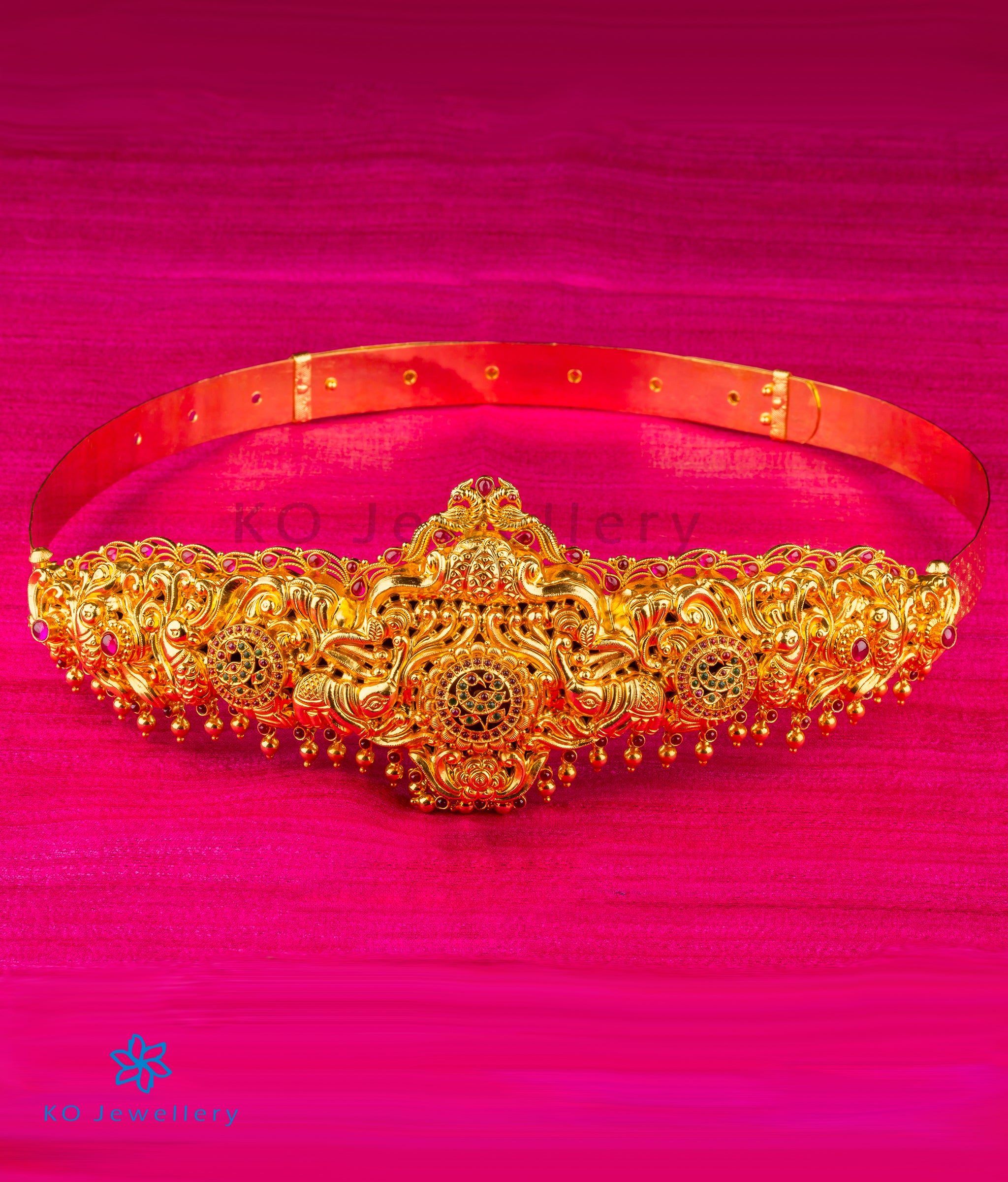 This is an ornate bridal waist belt handcrafted in a traditional design in Sterling Silver (92.5%) , decorated with peacocks and elephants. Variously called `Daabu' , `Vaddanam' , `Oddiyanam' or `Sonta patti' the waist belt is an important component of a bride's attire in South India. The waist belt is adjustable to any waist size.