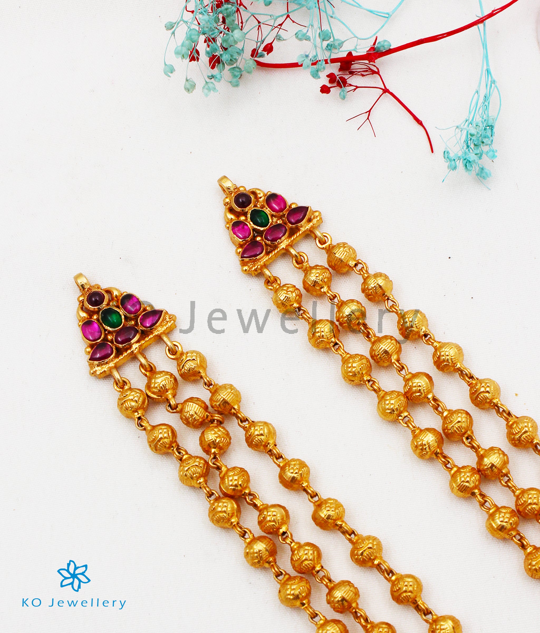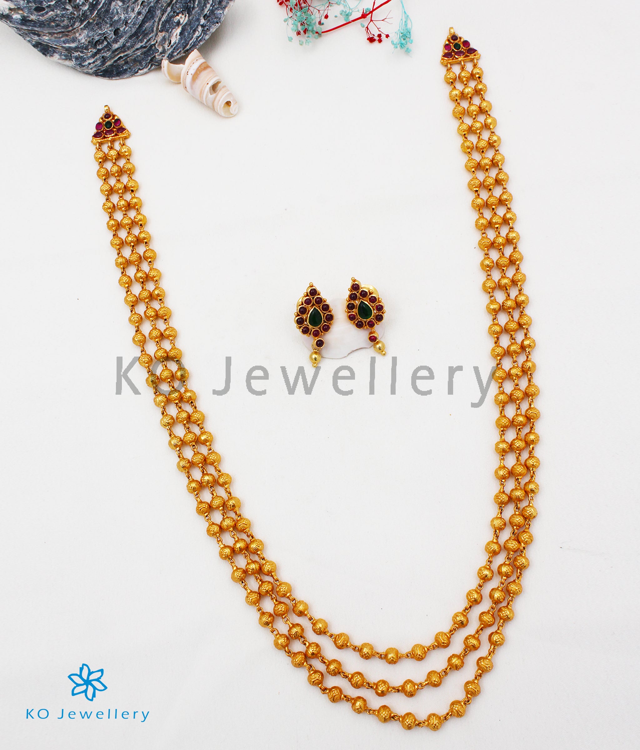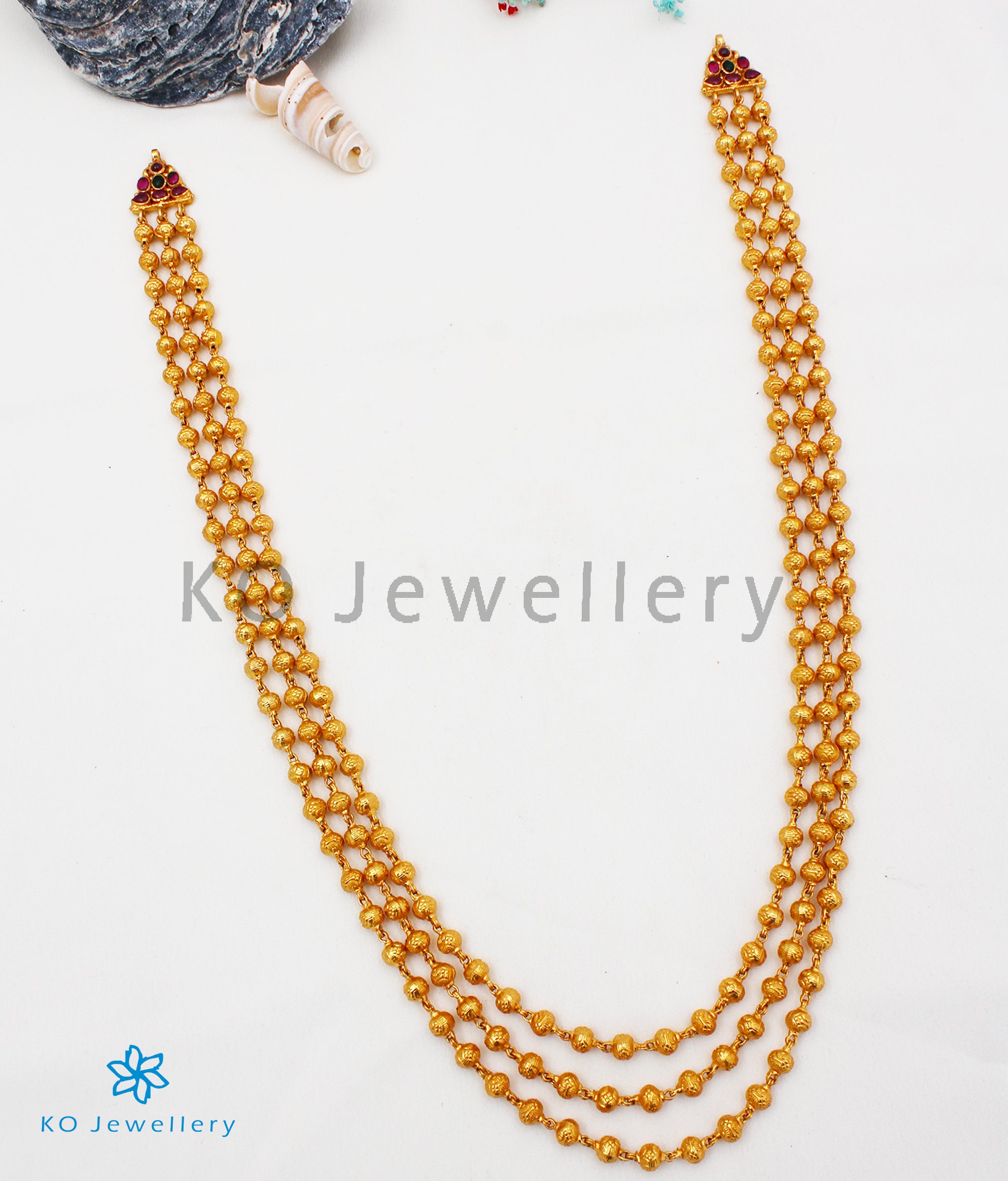 A classic and traditional design, this ornate and lengthy necklace in three layers is truly a head-turner.The necklace is made up of gold-dipped, Sterling Silver (92.5%) beads called Mohanmale which is a traditional centuries old ornament worn by women in south India.The beads have a unique floral design and are handwoven in silver wire and dipped in 24 karat gold.