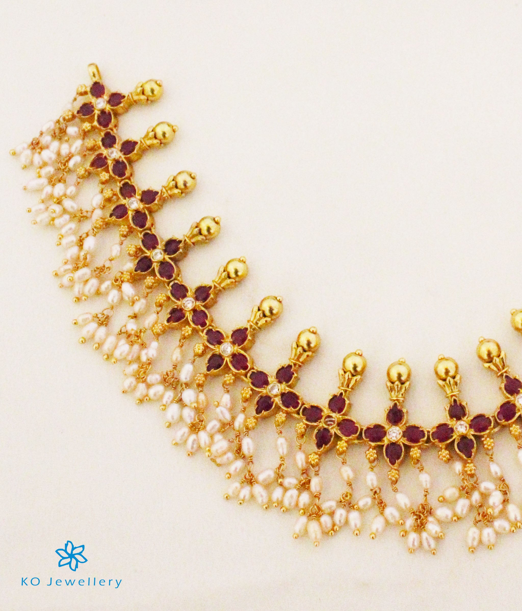 Catch everyone's attention with this beautiful Sterling Silver (92.5%) necklace decorated with kempu stones and natural Pearls, which will match any oufit. Crafted using techniques used in ancient South Indian antique gold temple jewellery the entire piece is crafted in pure silver and dipped in 24 karat gold.