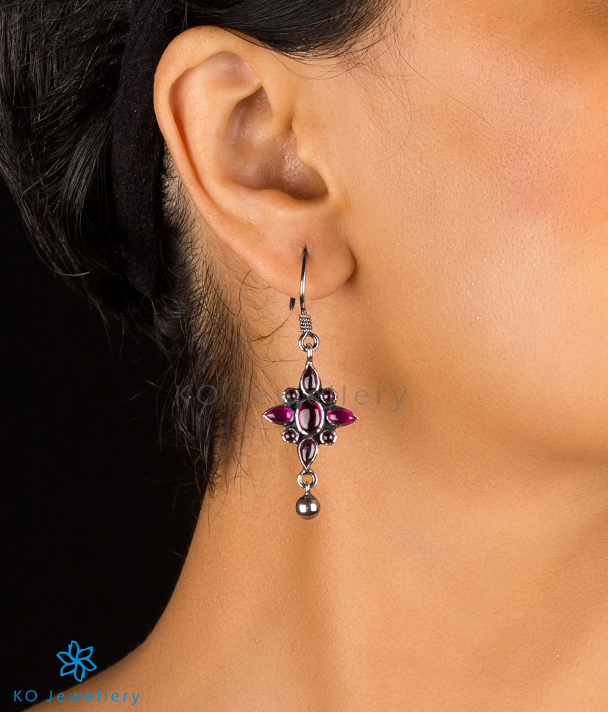 This is a lovely pair of earrings, handcrafted with an intricate design and decorated with kempu stones. Crafted using techniques used in ancient South Indian antique gold temple jewellery the entire piece is crafted in pure Sterling Silver (92.5%) and oxidised.