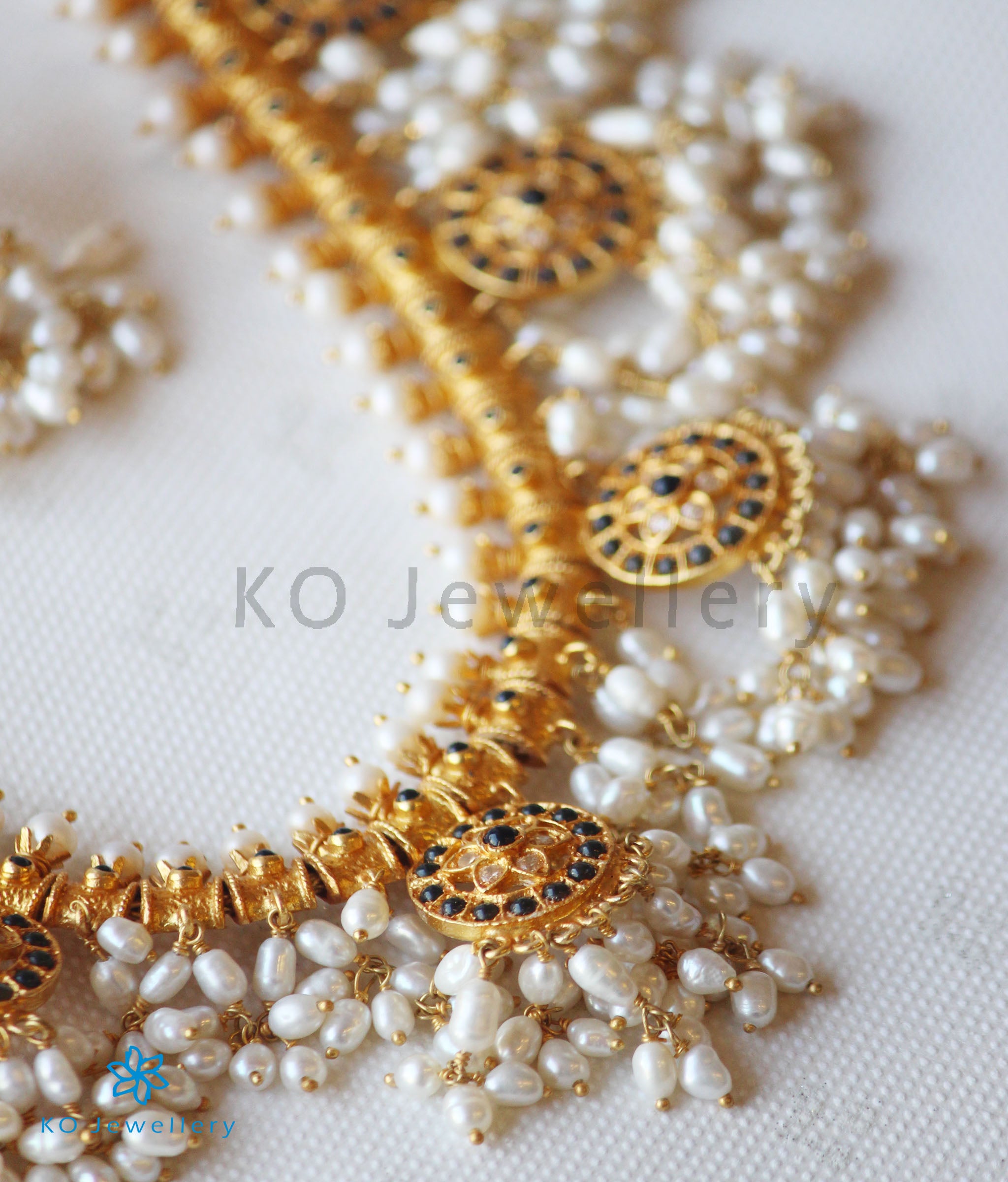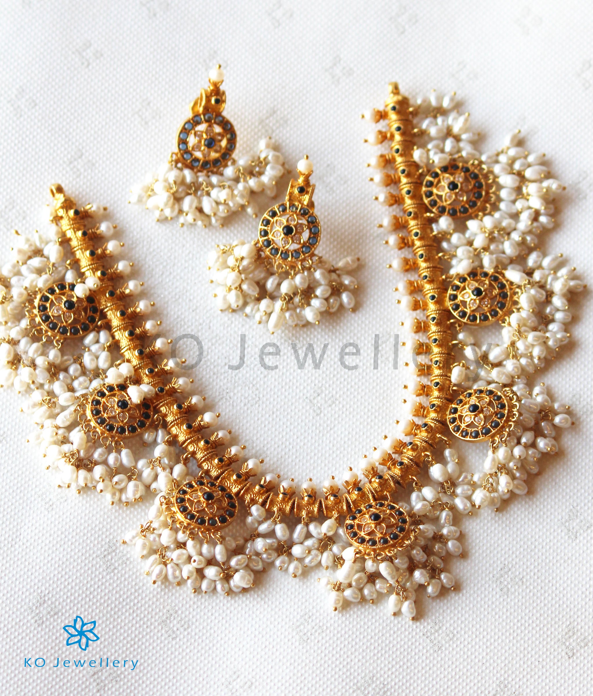 Feel like royalty when you dress up in this gorgeous piece of heritage jewellery .The Gutta Pusalu is a classic design from Andhra Pradesh and is named so because the necklace is fringed with bunches of small pearls very similar to "a shoal of small fish" (gutta) .Pusalu means "beads" and this design originated in areas close to the ancient pearl fisheries along the Coromandel coast of India.