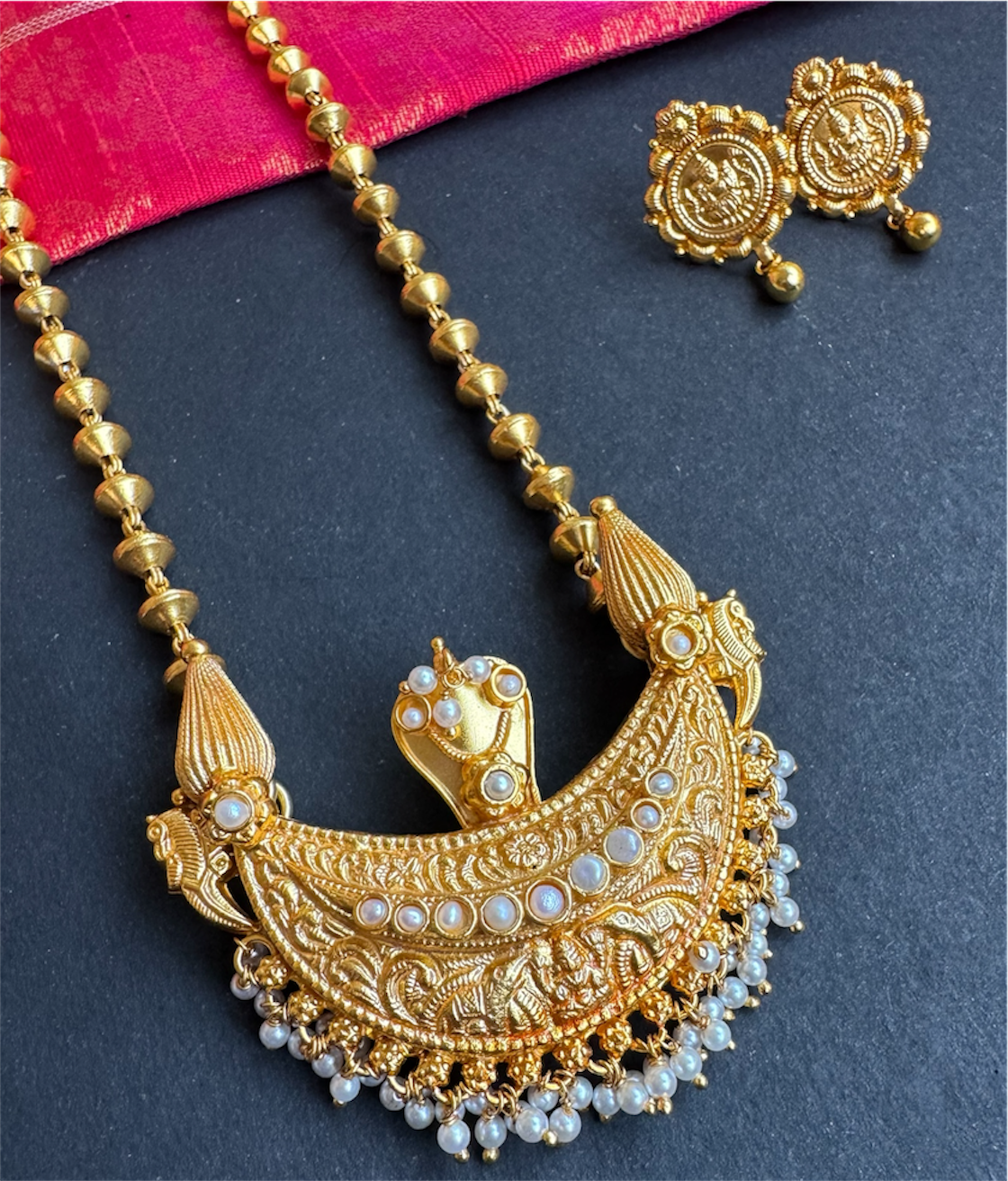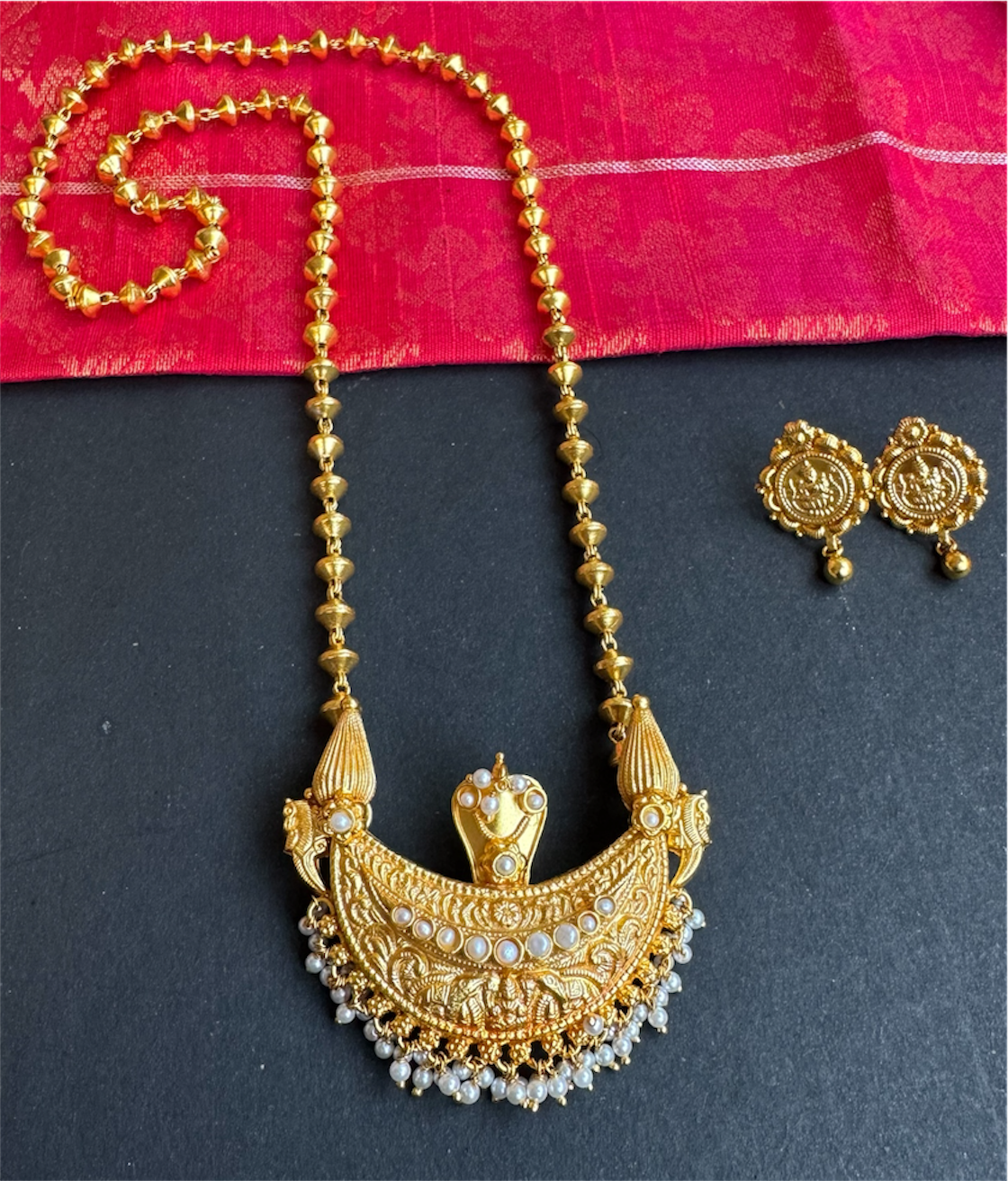 It features the classic crescent-shaped pendant adorned with a serpent motif at the helm—a symbol of protection. The rim of the pendant is delicately fringed with pearls, adding grace and movement, and it is paired with a patterned beads chain that completes its timeless Kodava aesthetic.
