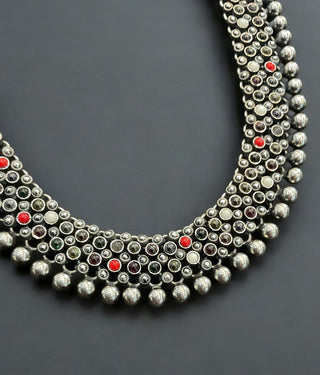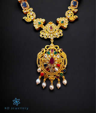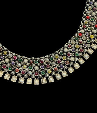In Indian society, jewellery is not meant for adornment alone, imparting protection to the wearer has been and still is an important function. According to Hindu astrology, life on earth is influenced by the `navagrahas', or nine influencers. Navratna jewellery brings harmony between man and the planets that are believed to control his destiny.Crafted using Sterling Silver 92.5% and a combination of "nine gems" recognised as sacred and said to provide an astrological balance/benefit to the wearer this collection includes a range of handcrafted Navratna Temple Jewellery in unique designs. Crafted using Natural Pearl, Cat's Eye, Garnet, Recreated Coral and Zircon, the pieces in this collection are a feast for the eyes.Read more in our blog..Â