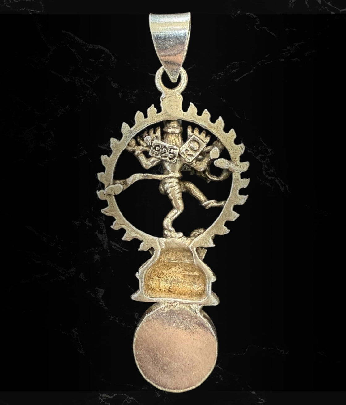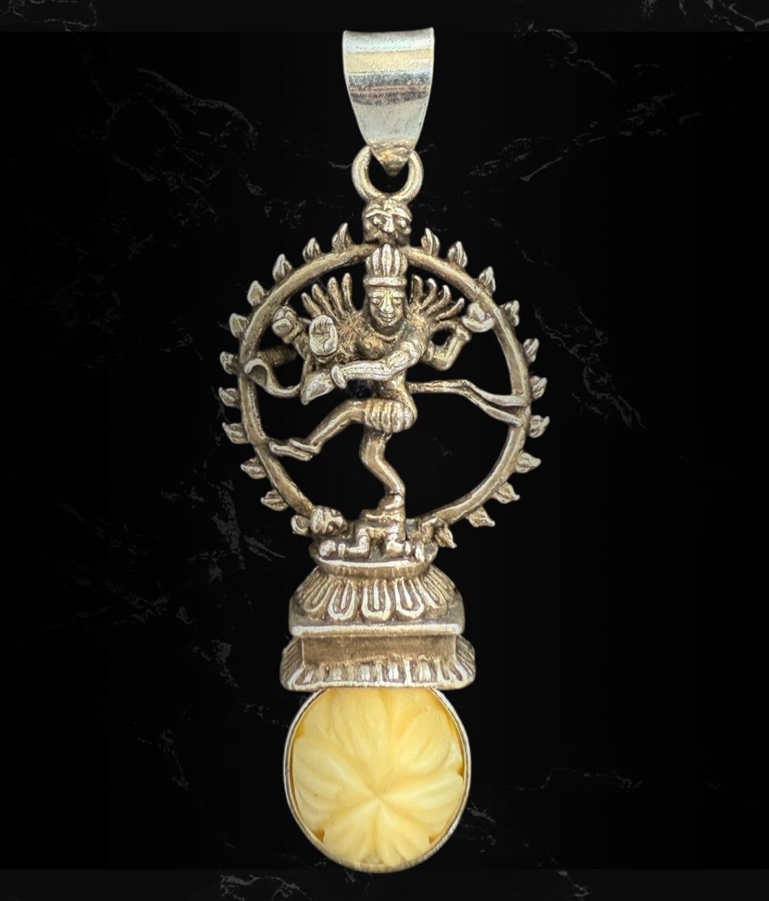 This exquisite pendant features Nataraja, Lord Shiva in his form as the divine cosmic dancer, symbolising the eternal cycle of creation, preservation, and dissolution of the universe. The rich iconography of Nataraja embodies cosmic energy and spiritual transcendence, with every element holding deep symbolic meaning.