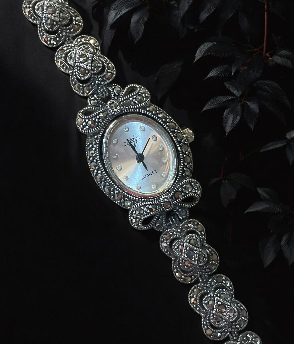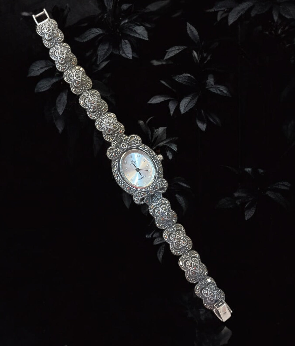 Discover the epitome of elegance with our 925 Silver Watch — a truly luxurious accessory designed to dazzle. Entirely crafted from high-quality Sterling Silver (92.5%) it exudes timeless beauty and sophistication. The watch is studded with stunning Swiss marcasite stones, creating a mesmerizing sparkle that catches the light with every movement. Its utterly feminine design, with its glittering, irresistible allure, makes it the perfect statement piece for any occasion. Whether you're dressing up for a special event or adding a touch of glamour to your everyday look, this watch is the ultimate blend of style and luxury. Elevate your accessory game with a piece that radiates charm and refinement. Indulge in the luxury you deserve—order yours today!
