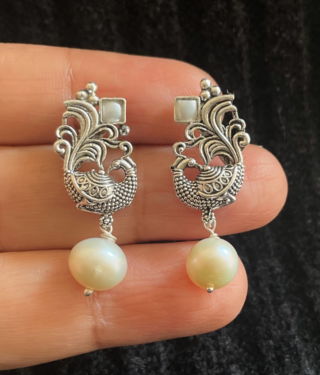 The Anavila Silver Peacock Pearl Earrings - Buy Antique Temple silver jewellery online - KO Jewellery