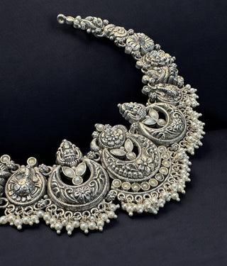The Vajra Shankhu, Chakra Nama Silver Pearl Necklace & Earrings (Oxidised)