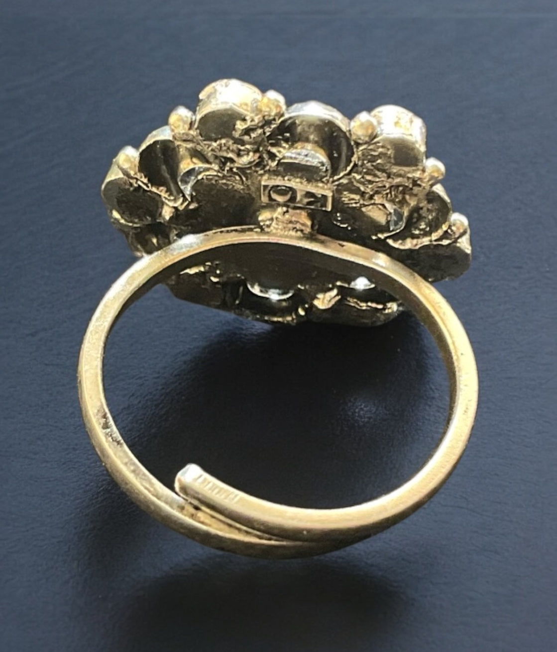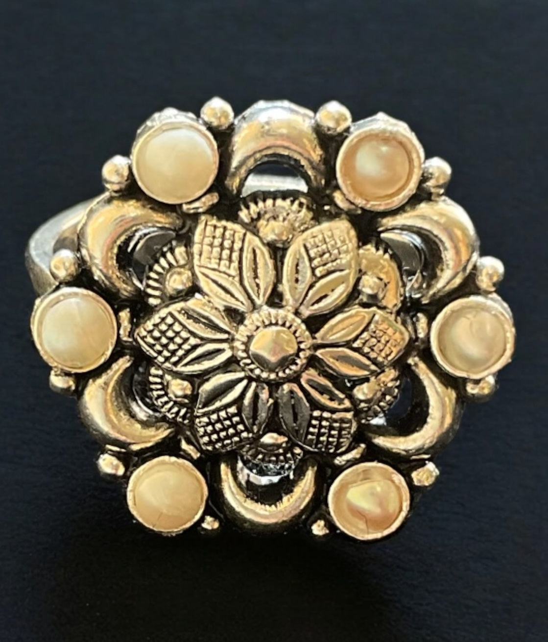 A gorgeous finger ring handcrafted in pure sterling silver (92.5%) . This ring features an intricate floral design at its center making it visually appealing. You can adjust the open silver band at the back of the item according to your size.