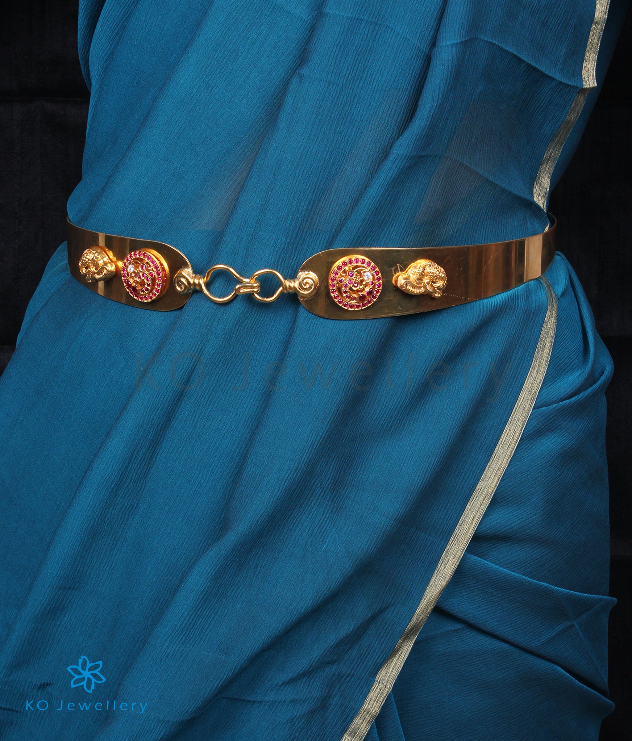Here we present a heritage design waist-belt used extensively in Karnataka and Maharashtra regions, this is one design that is centuries old. Variously called `Daabu' , `Vaddanam' , `Oddiyanam' or `Sonta patti' the waist belt is an important component of a bride's attire in South India. This is a classic , versatile design with four peacock motif kemp stone pendants that will never go out of favour. Pair it with a traditional outfit or wear it on a evening gown you cant go wrong with this stunner.