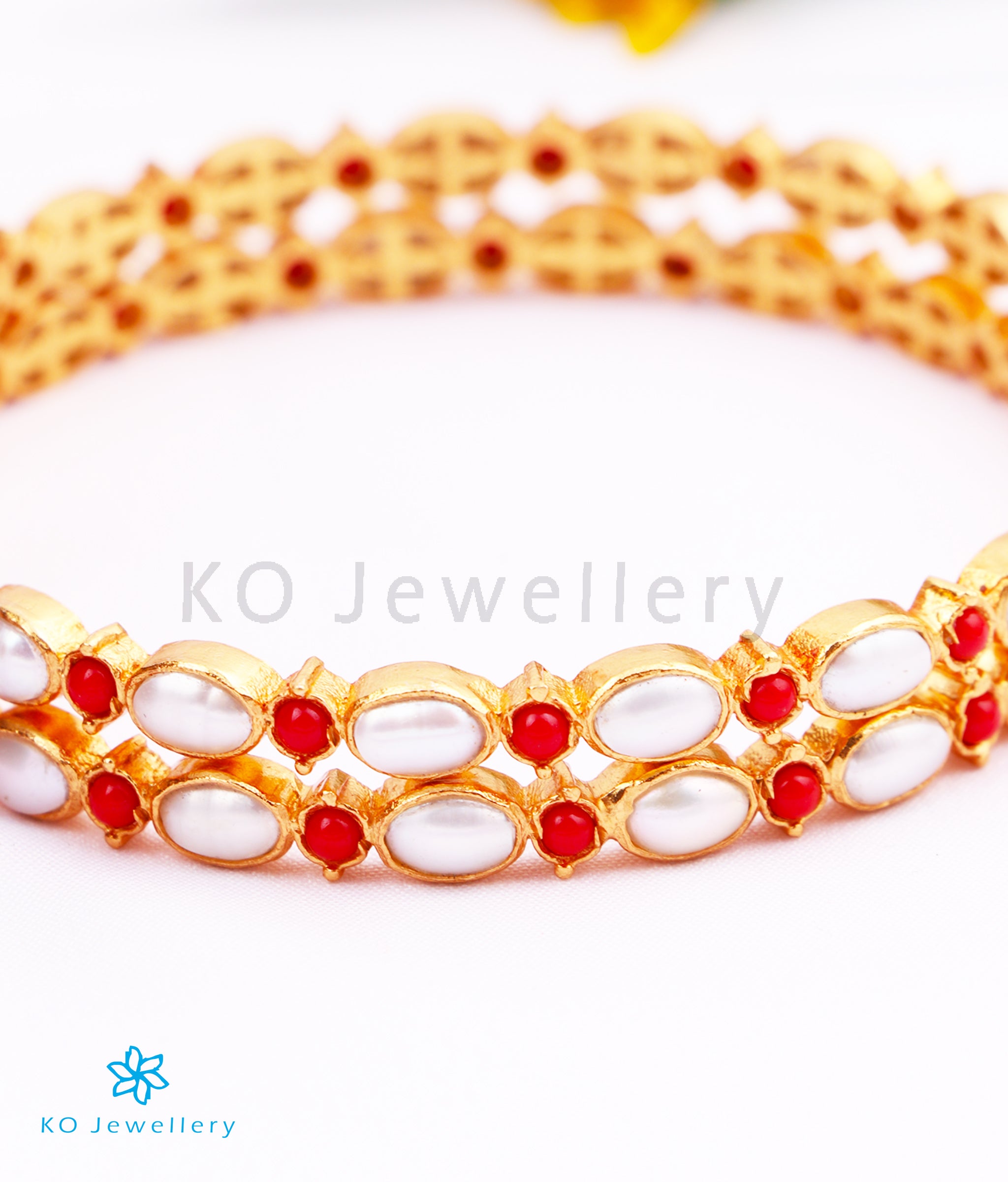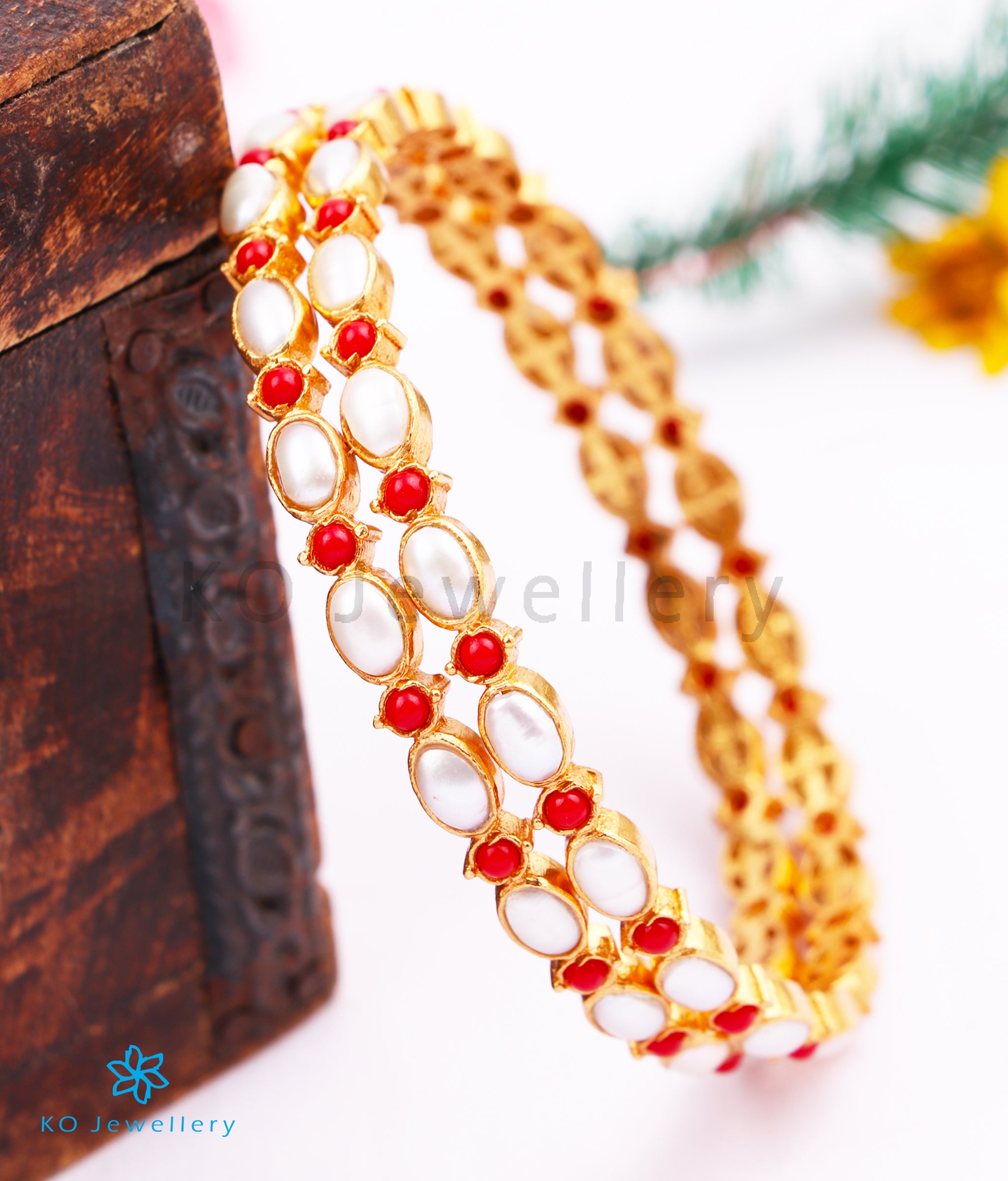 Handcrafted in pure Sterling Silver (92.5%) and gold-dipped this bangle uses natural Pearl and powdered Coral . The price listed is for a single bangle.