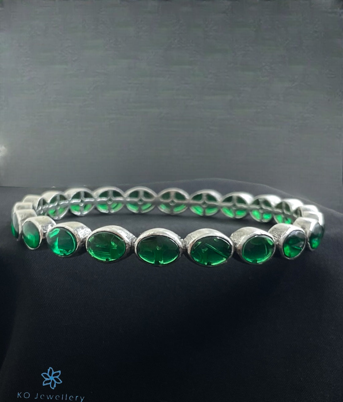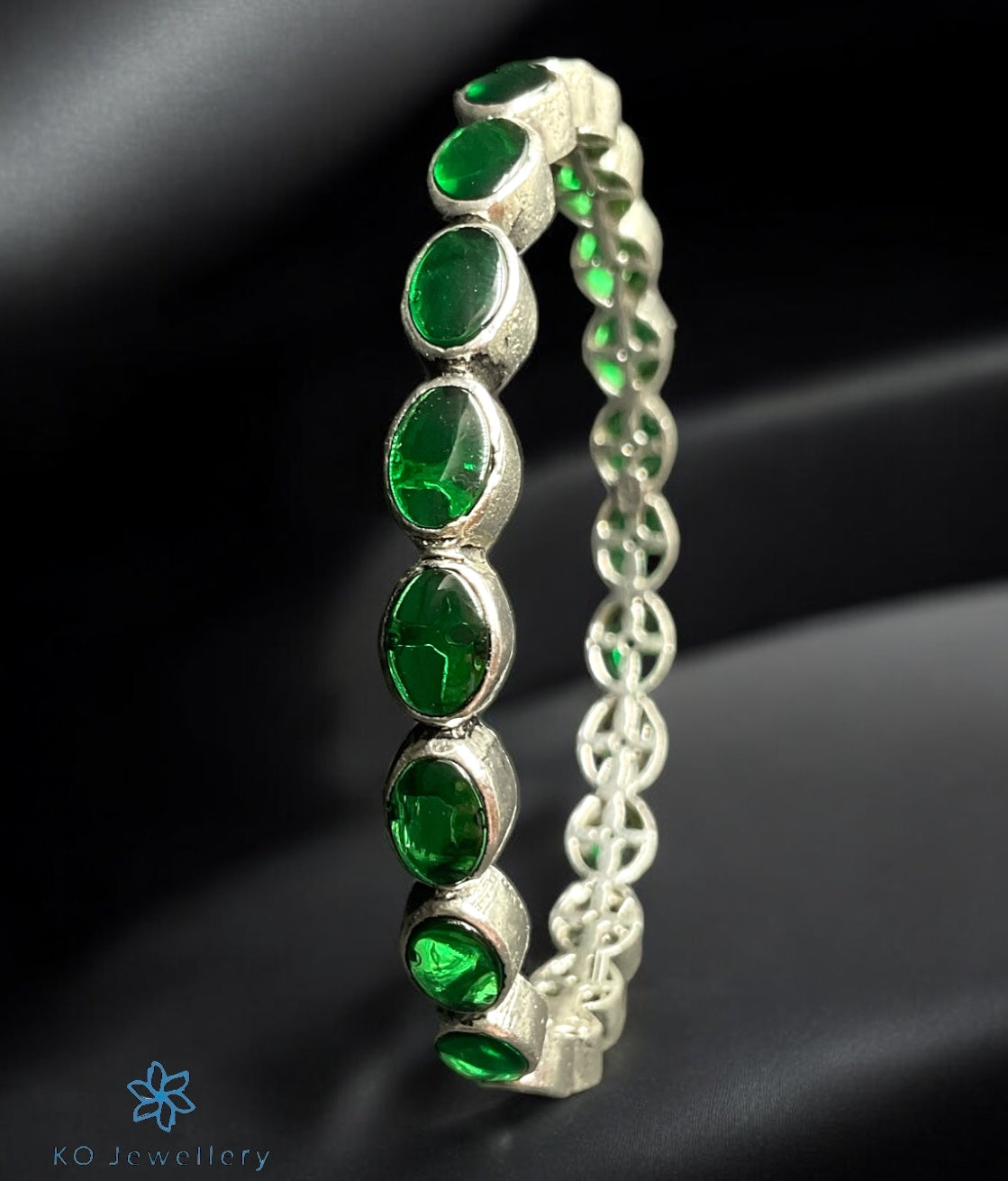 A stunning bangle with oval kemp stones this Sterling Silver (92.5%) handcrafted bangle is a classic design. You could choose to buy it single or in a pair. The price listed is for a single bangle.