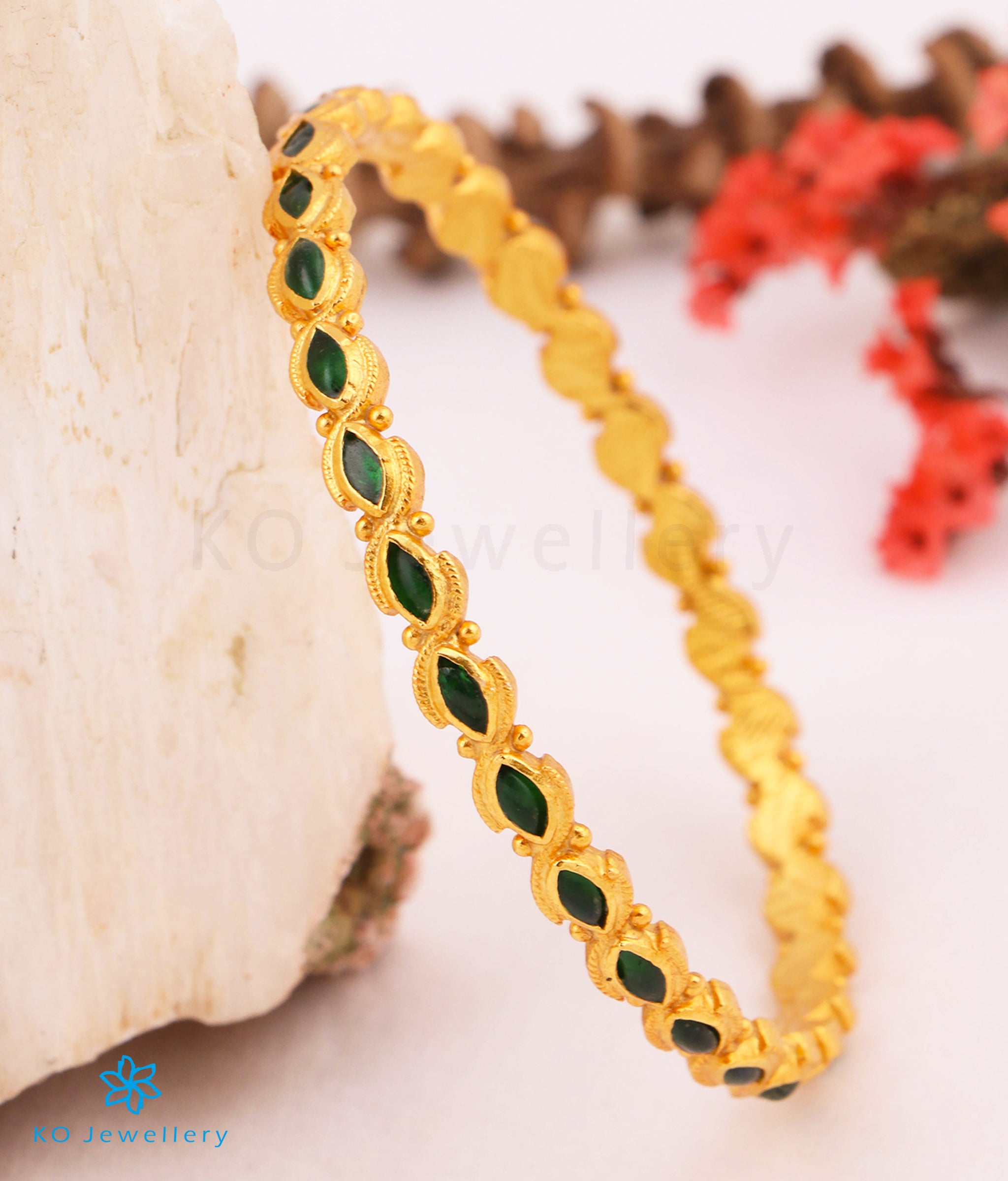 An attractive and delicate Sterling Silver (92.5%) bangle handcrafted to perfection to look graceful on every hand . The ornate design on the bangle is accentuated by green kempu stones .Buy a pair of these bangles to complement your ethnic wear this festive season. The price listed is for a single bangle.