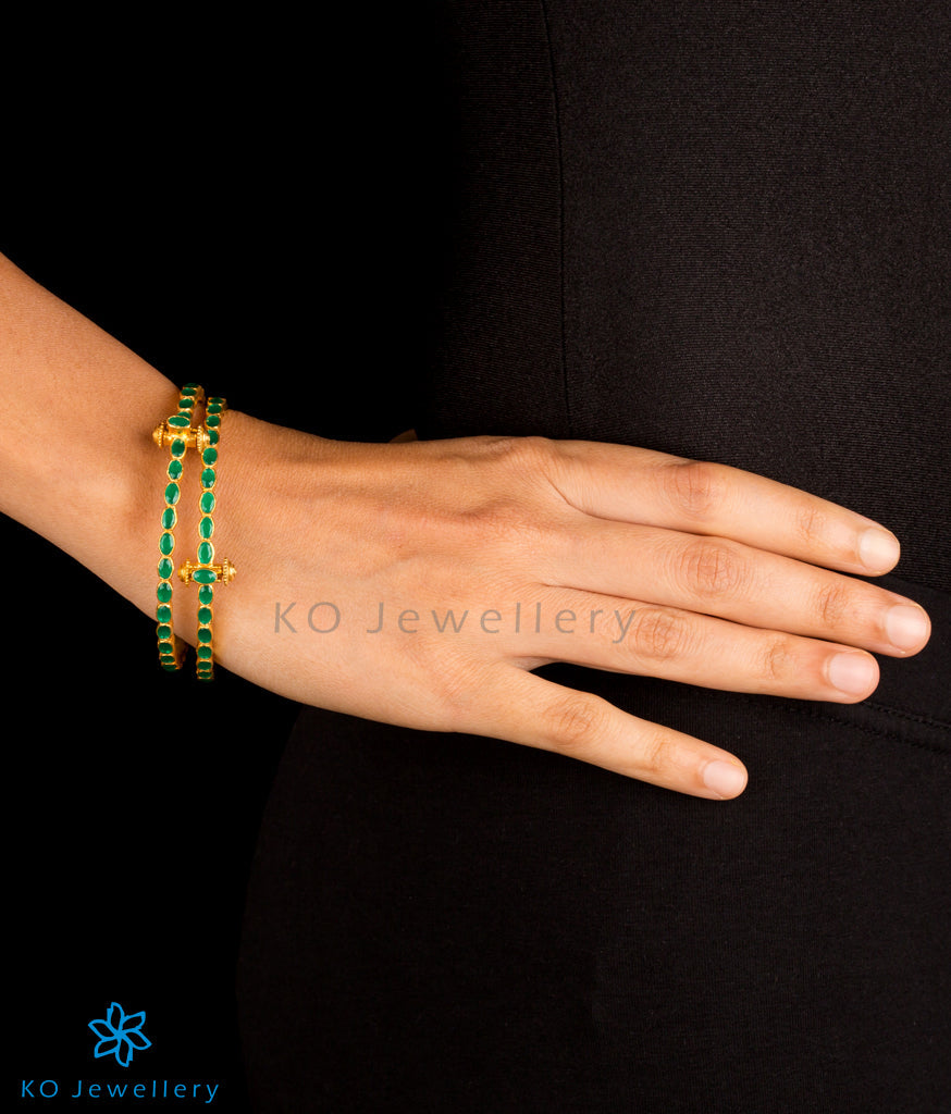 A pretty bracelet with beautiful oval-shaped green stones handcrafted in Sterling Silver (92.5%) ,this makes a great accessory. This seamlessly handcrafted bracelet can be opened to gently fit your hand. You could choose to buy it single or in a pair. The price listed is for a single bangle.