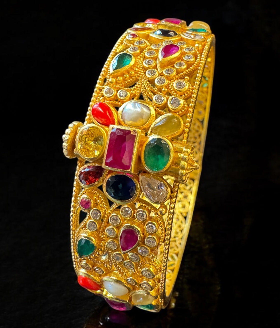 This is a gorgeous bracelet which is decorated with navartna stones. Handcrafted in Sterling Silver (92.5%) and gold-dipped ; this unique design will make a great addition to your collection. This seamlessly handcrafted bangle can be opened to gently fit your hand. You could choose to buy it single or in a pair. The price listed is for a single bangle.