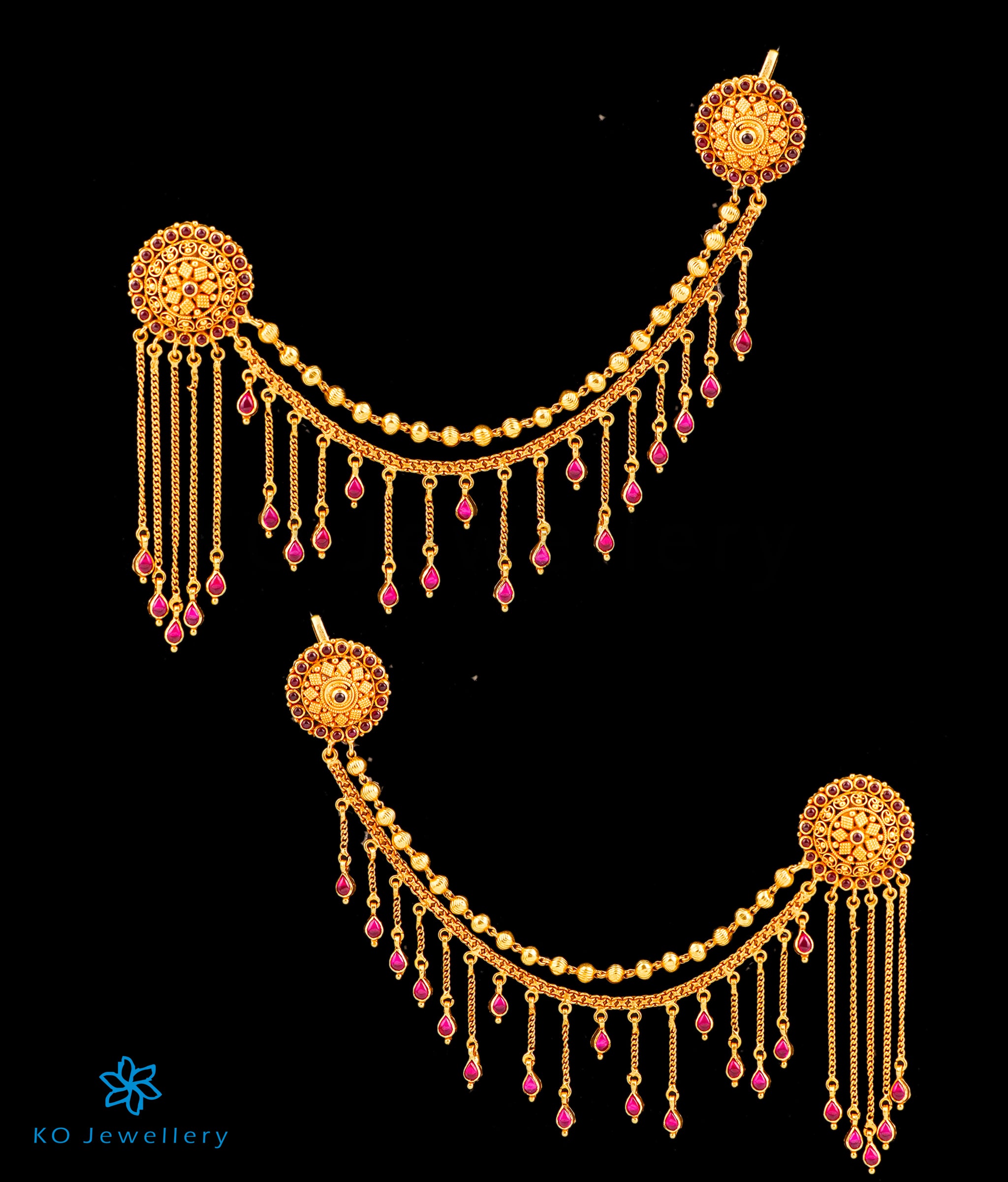 A pretty pair of sterling silver (92.5%) ear-studs handcrafted to perfection and decorated with kempu stones. This is a classic pair of ear-studs that can match effortlessly with your wardrobe, Ear-cuffs are definitely a head-turner. This is an ornate earring one part of which is worn in the ear while the other part comes with a hook and is hung behind the ear on the hair.