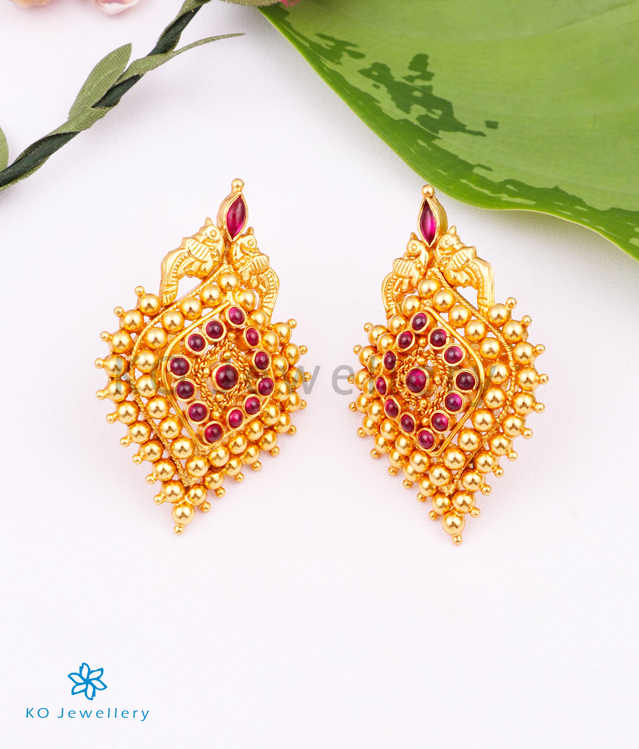 An ornate and intricate pair of earrings topped with twin peacocks and studded with kempu stones . This pair is handcrafted in Sterling Silver (92.5%) using techniques used in ancient South Indian antique gold temple jewellery.