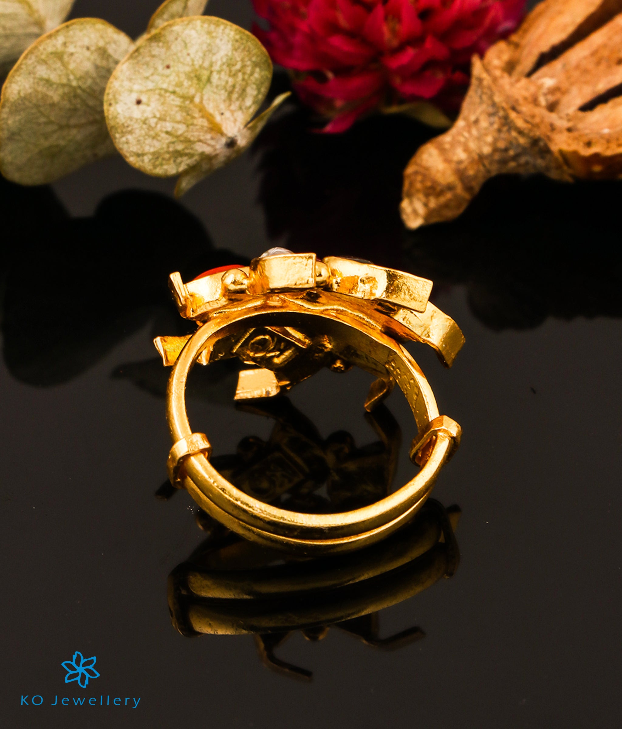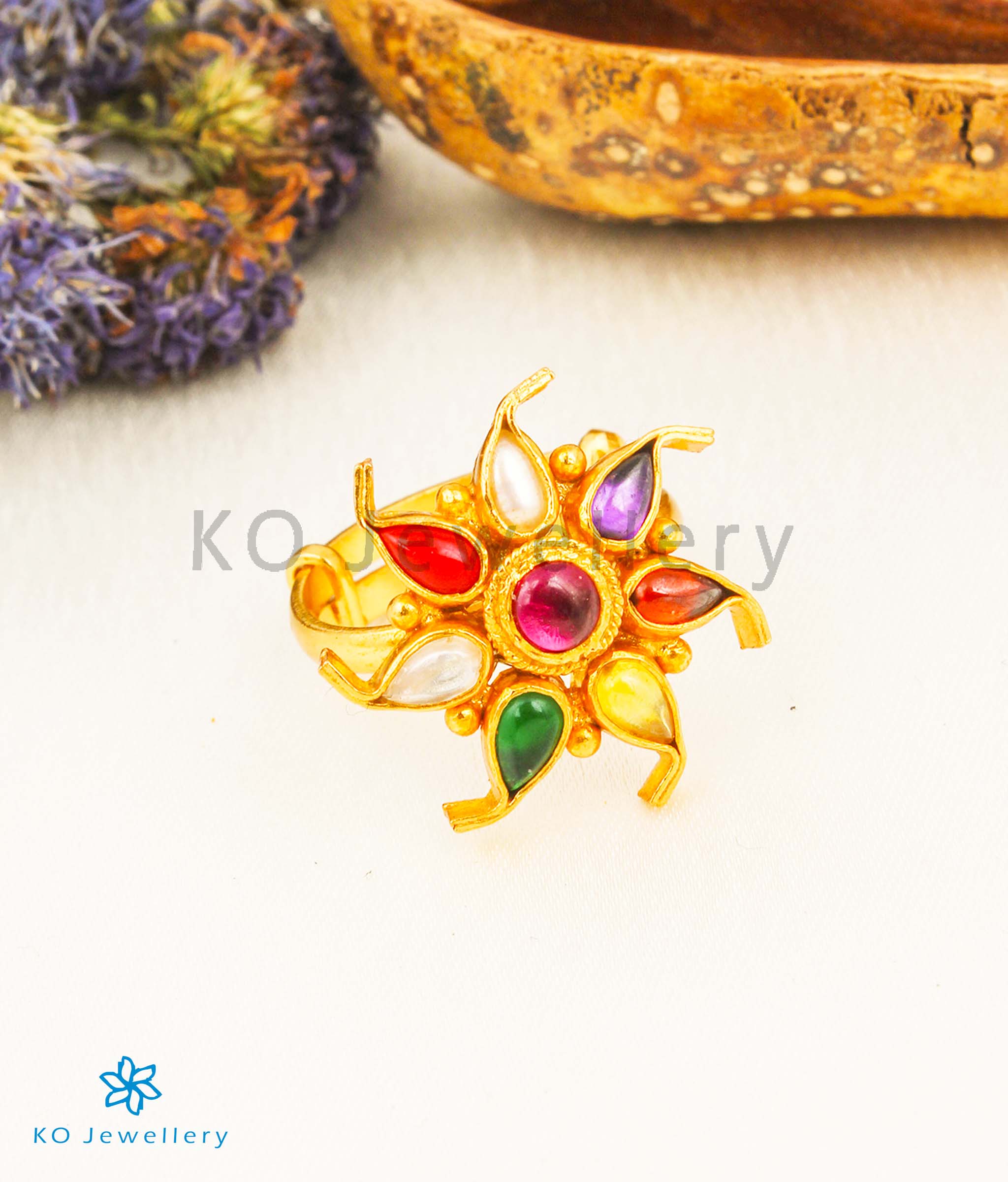 This ornate navratna stone finger ring is truly a head-turner.Crafted using techniques used in ancient South Indian antique gold temple jewellery the entire piece is crafted in pure Sterling Silver (92.5%) and gold-dipped in 24 karat gold.This ring is adjustable according to the size of your finger.